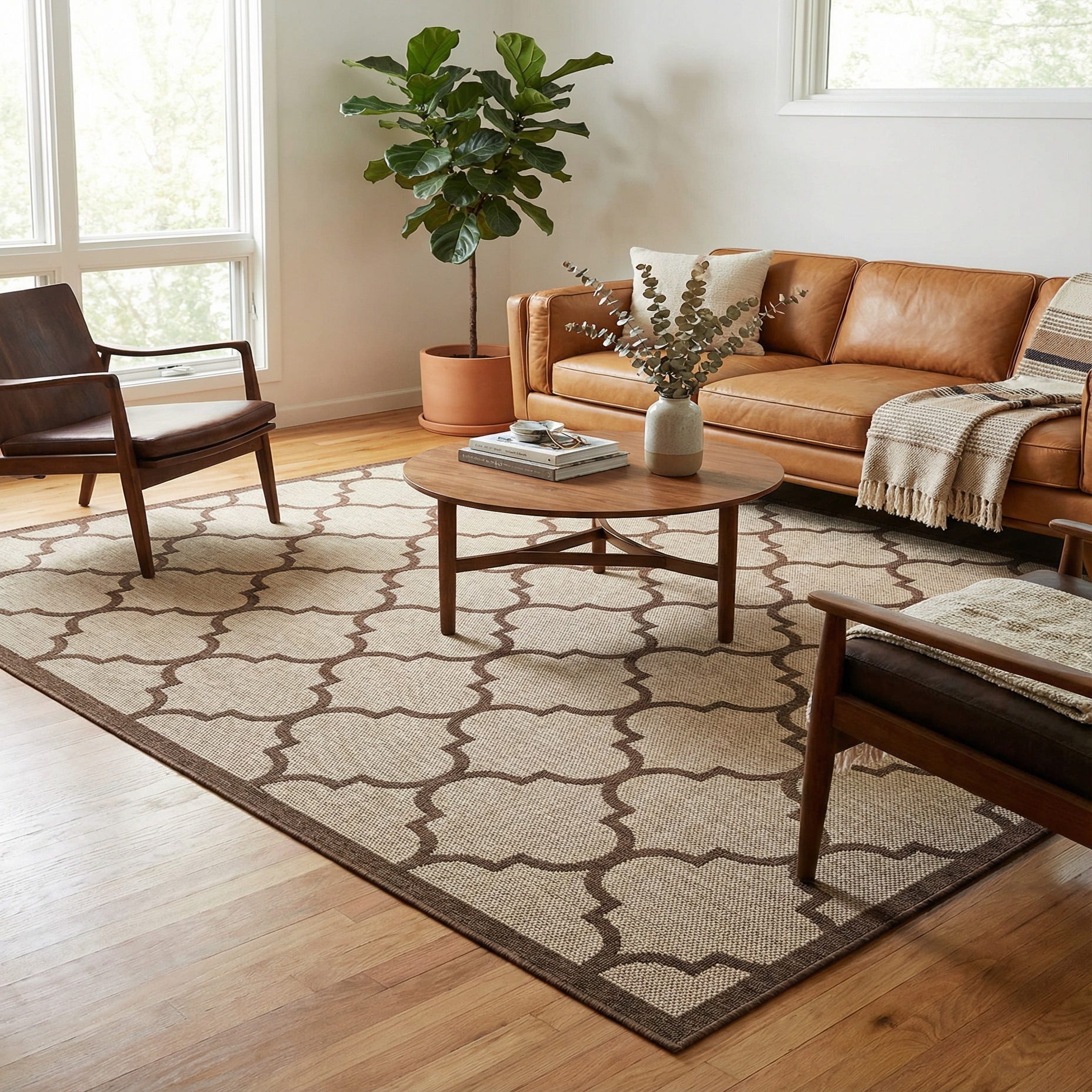 The neutral colorway and geometric pattern suit a range of interiors. Pair it with a cream or light-gray sofa and a walnut coffee table for a relaxed living room, place it beneath a dining table to anchor a natural-wood set, or use it in a bedroom to introduce pattern without overwhelming the palette. It also complements linen upholstery, leather accents, and matte metal finishes for a cohesive, contemporary-traditional scheme.