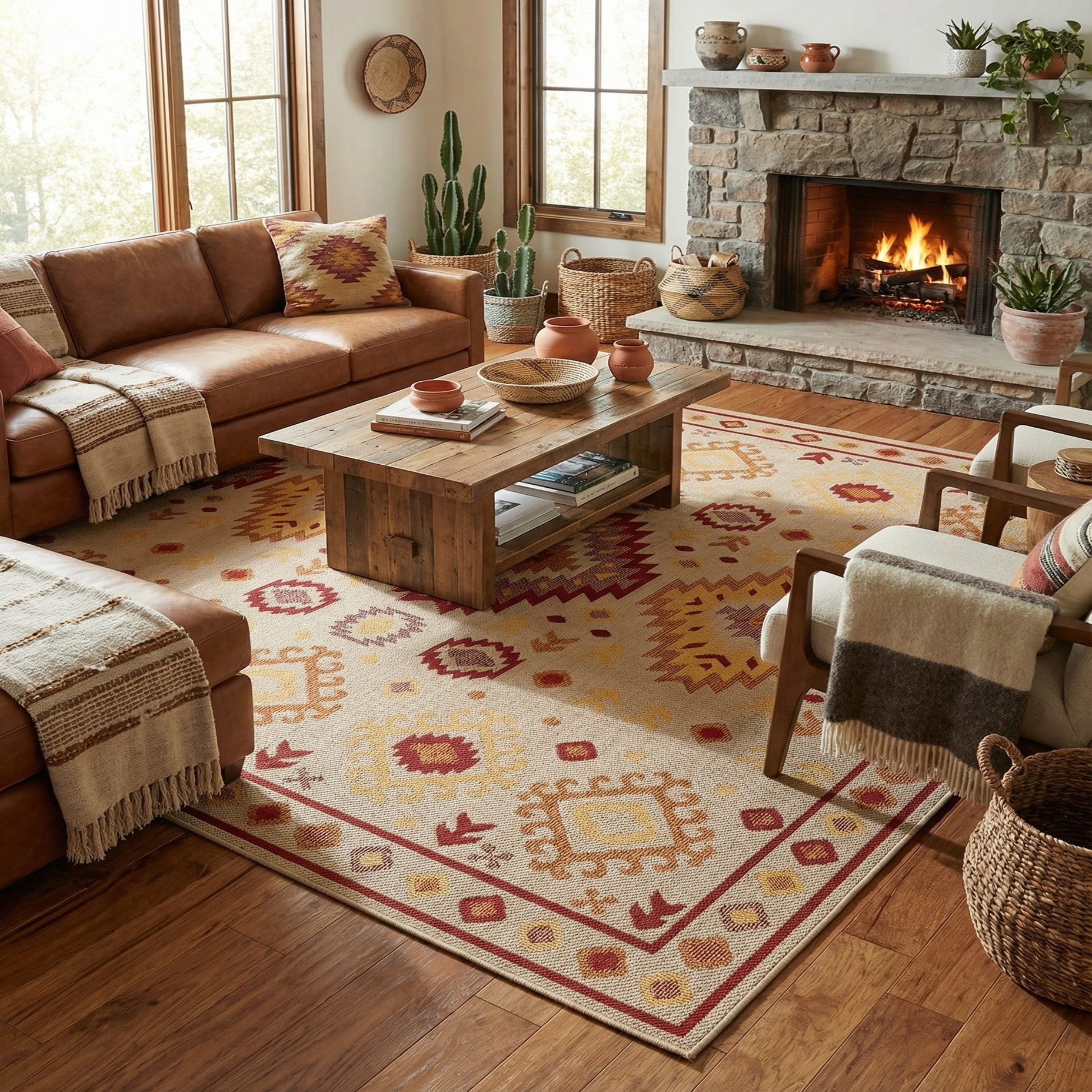 A warm beige field framed by a rust red border sets the stage for a lively geometric composition. Three large stepped diamond medallions run across the center in rust red, orange, peach and yellow, with smaller diamond and arrowhead motifs filling the field and a repeating diamond border at the edge. The pattern is inspired by southwestern kilim motifs, offering a balanced mix of bold shapes and smaller decorative repeats that read clearly from a distance yet hold interest up close.