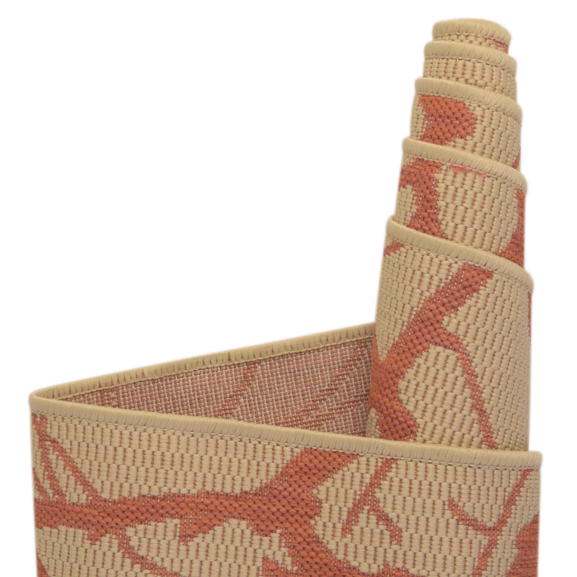 Machine made from 100% polypropylene, the rug has a low-profile, tightly woven texture that feels smooth and slightly firm underfoot, with a subtle ribbed surface that keeps the pattern crisp. It’s well-suited for covered outdoor areas, sunrooms, patios, or poolside seating, and also works in living and dining rooms where a durable, low-pile surface is preferred. Pair it with rattan or weathered-wood furniture, natural linen textiles and terracotta accents for a cohesive look, or use it to add warmth and pattern to a neutral modern setting.