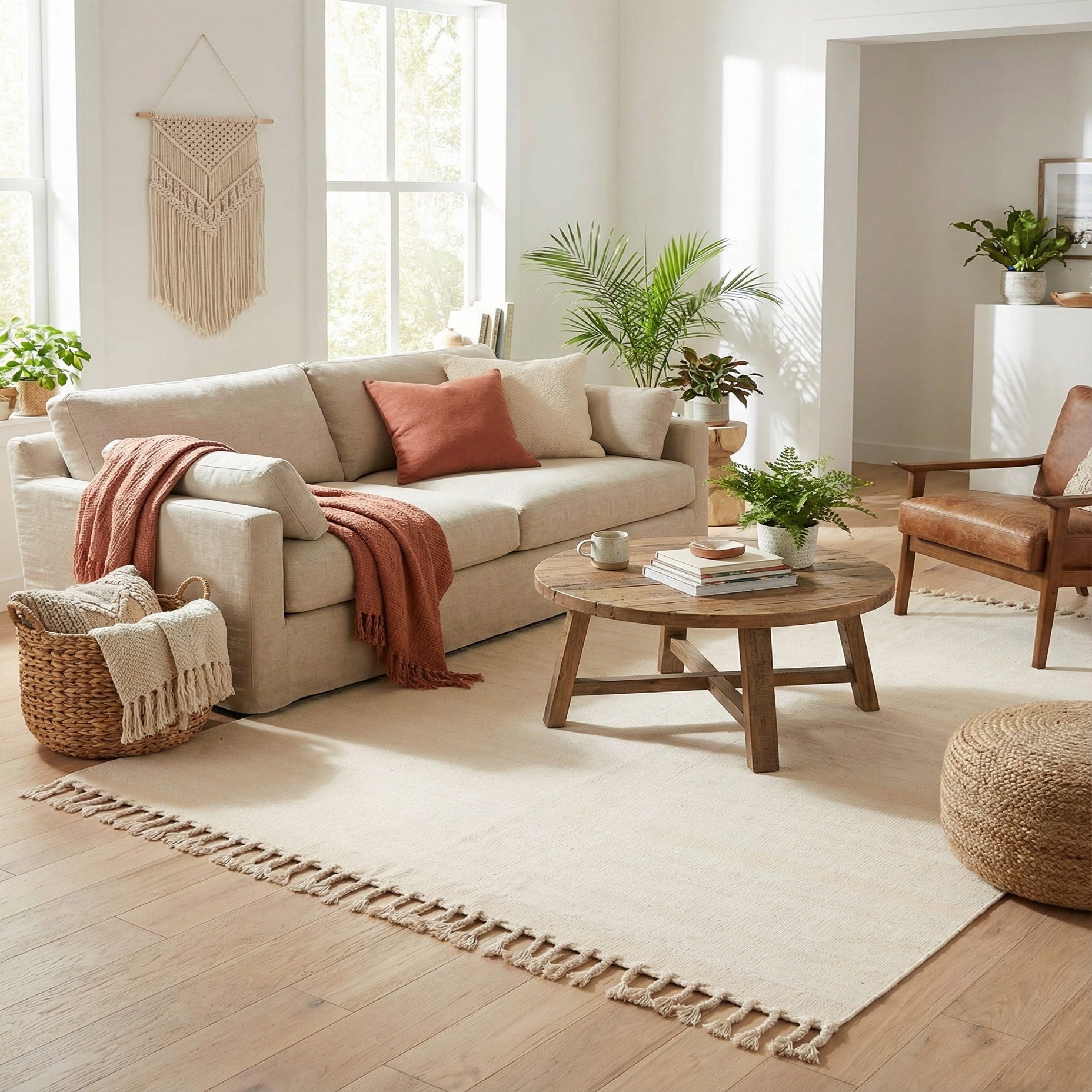 This neutral palette and understated pattern work well in a variety of interiors — layer it in a living room beneath a sofa and coffee table for a relaxed, modern look, place it at the foot of a bed to warm a minimalist bedroom, or use it in a coastal or farmhouse dining nook for soft visual interest. It also pairs nicely with light woods, linen upholstery, and matte metal accents for Scandinavian, bohemian, or contemporary-styled rooms.