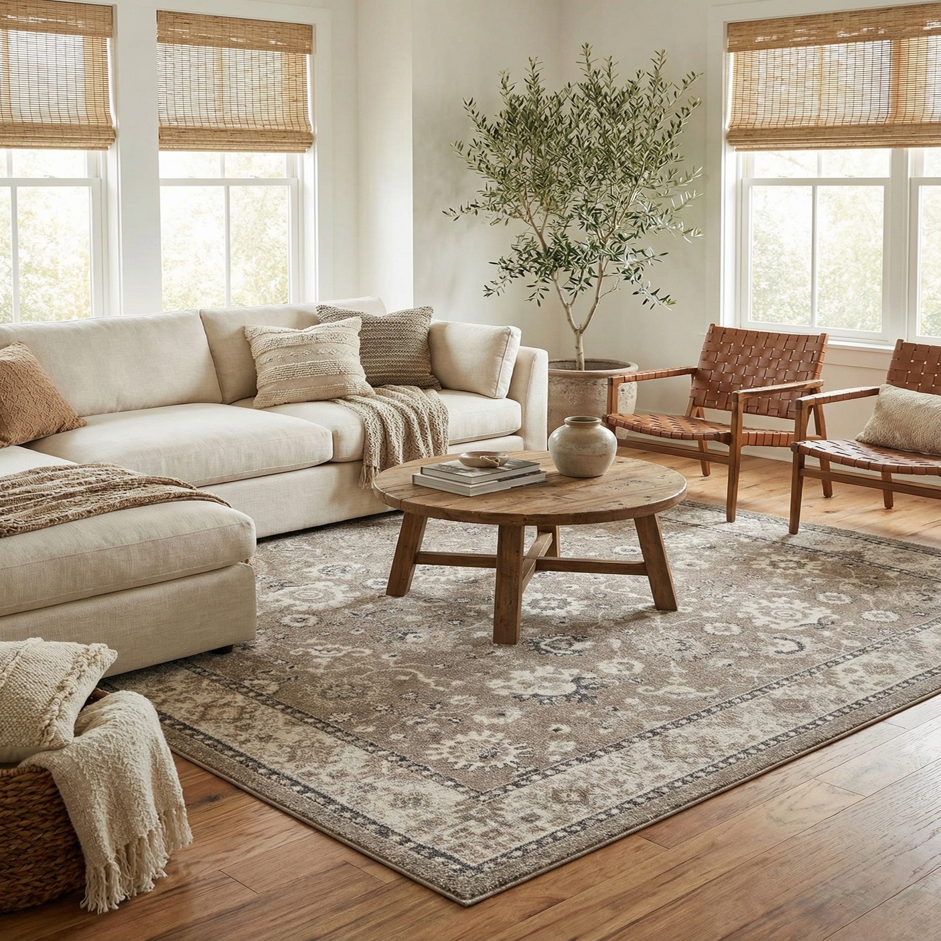 Place this piece beneath a seating group to anchor a living room, centered under a dining set in an open-plan space, or layered at the foot of a bed for a grounded, cohesive bedroom scheme. The neutral palette pairs naturally with warm wood tones, leather or linen upholstery, and brushed metal accents, making it well-suited to transitional, farmhouse, or traditional interiors that favor calm, muted colorways.