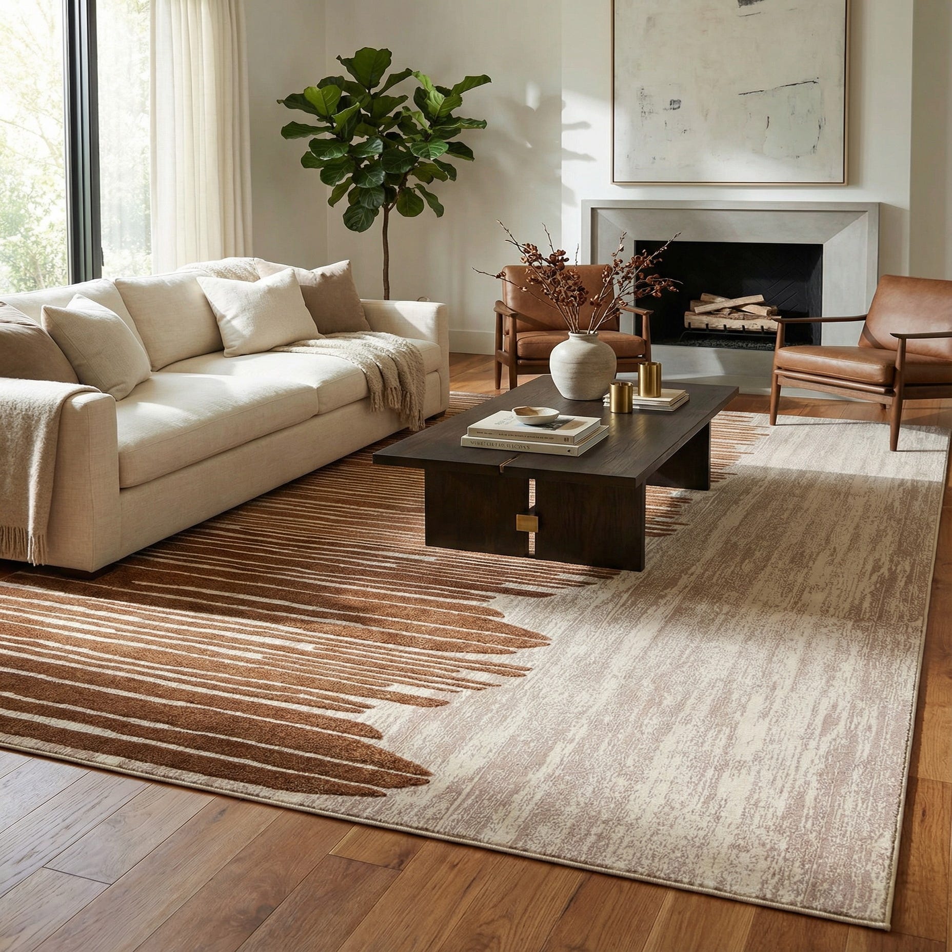 This design works well for covered patios, alfresco dining areas, or a modern living room where a warm, graphic element is needed without overwhelming the space. Pair it with warm wood furniture, woven outdoor seating, or neutral linen upholstery and ivory cushions to echo the color palette and emphasize the rug’s linear rhythm.