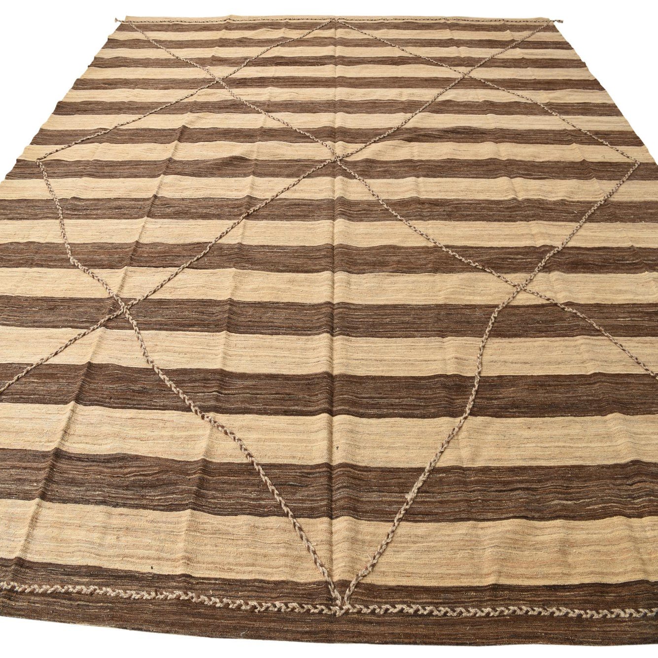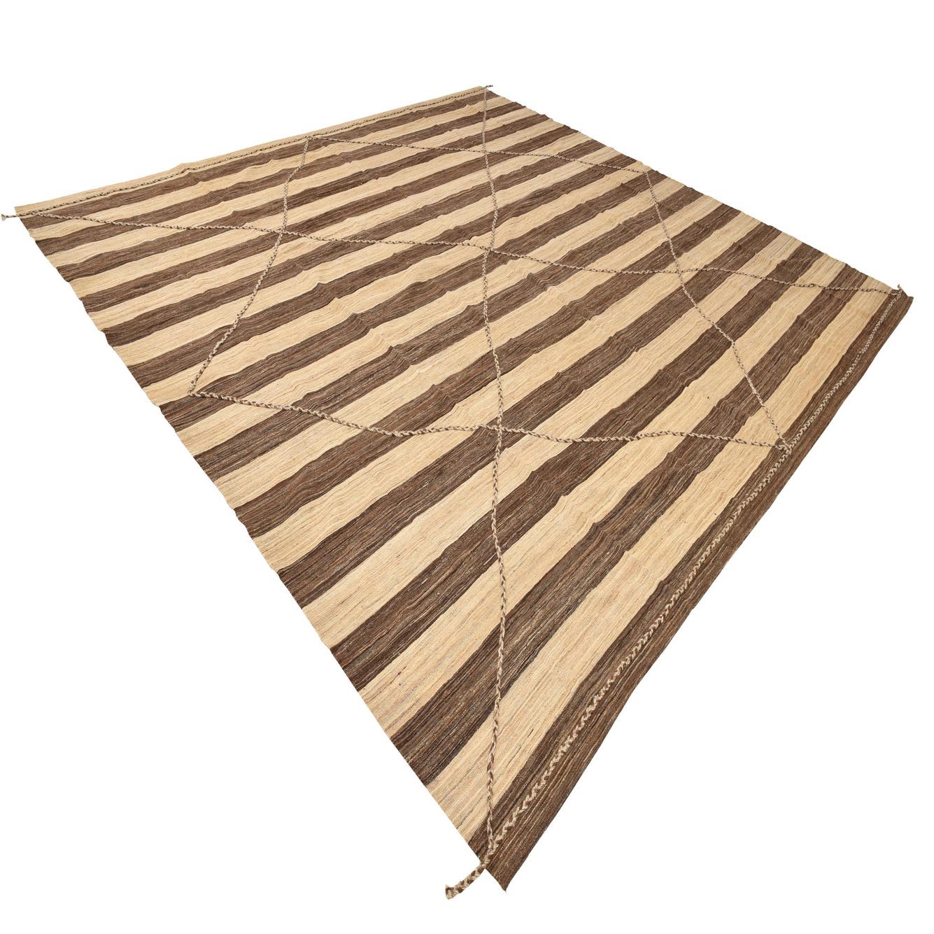 A large square rug featuring alternating vertical stripes of dark brown and natural tan, with a subtle diamond pattern overlay.