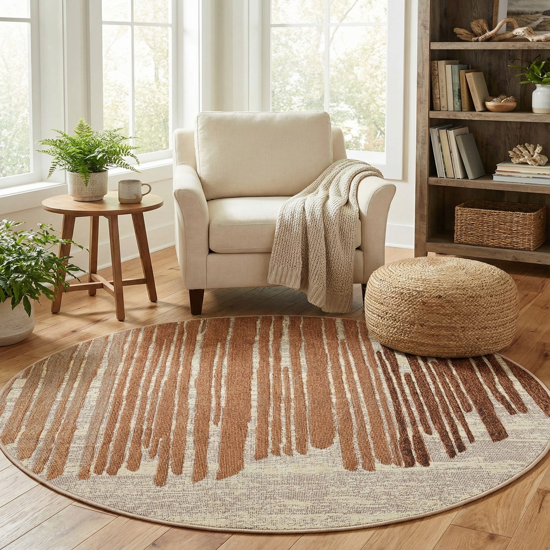 A round, flatweave outdoor rug featuring a modern abstract pattern of horizontal brown and tan stripes on a cream background.