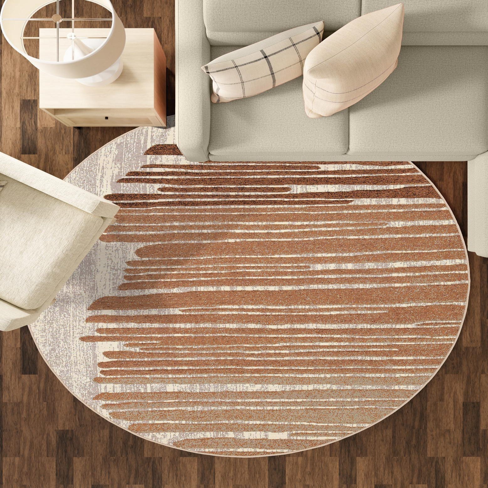 A round, flatweave outdoor rug featuring a modern abstract pattern of horizontal brown and tan stripes on a cream background.