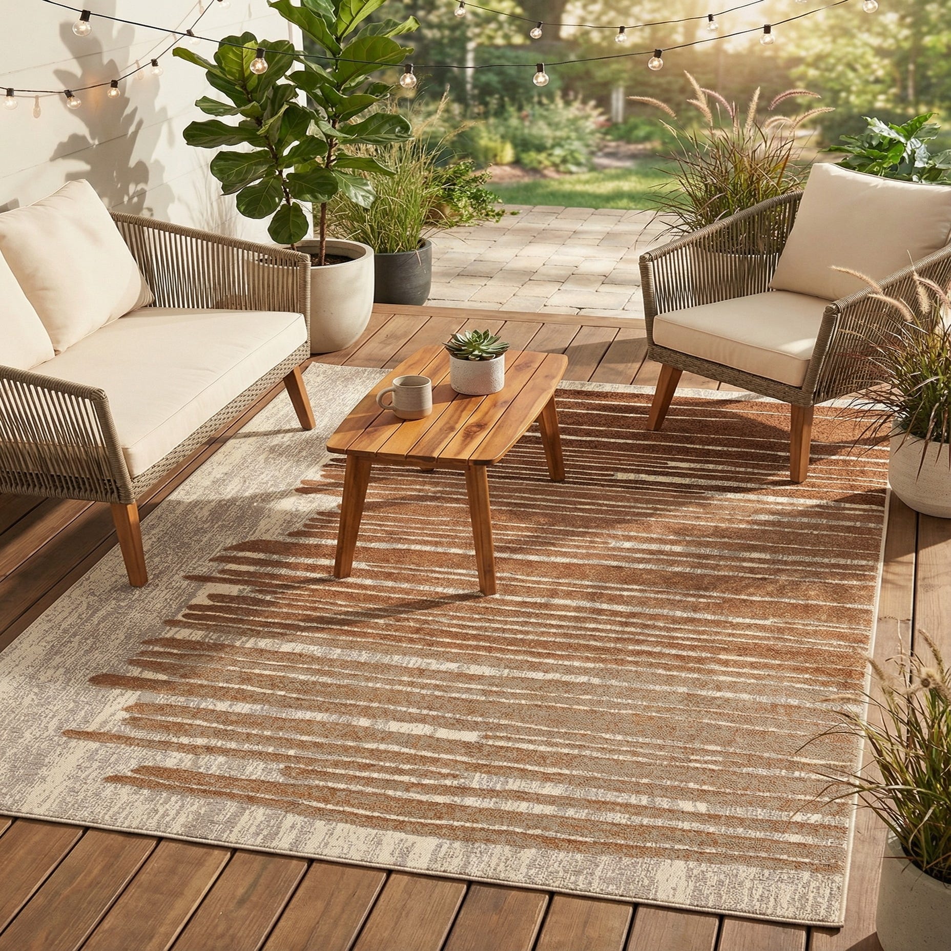 A rectangular 5x7 modern indoor/outdoor rug featuring horizontal abstract strokes in varying shades of brown, tan, and cream on a light background.