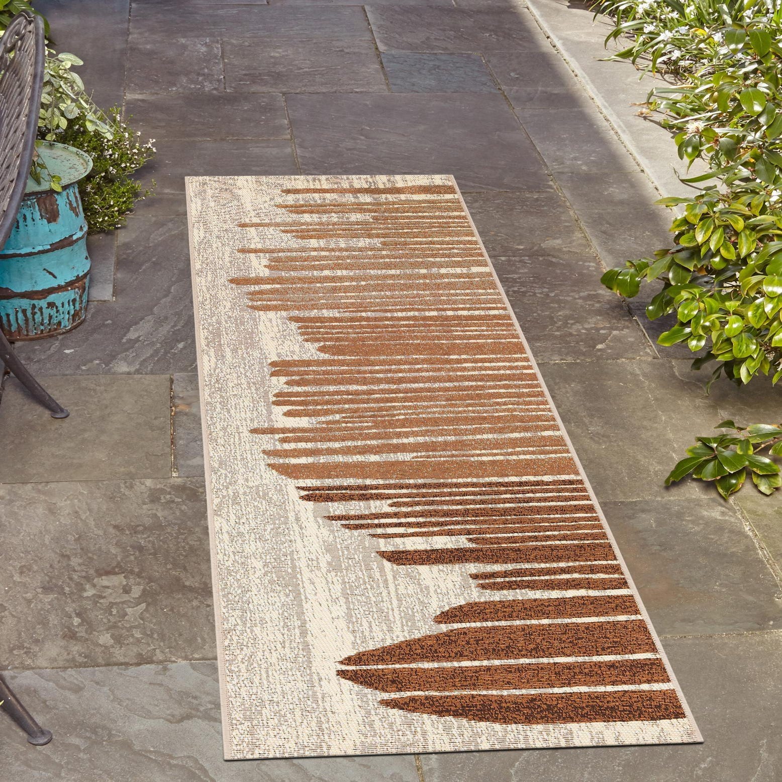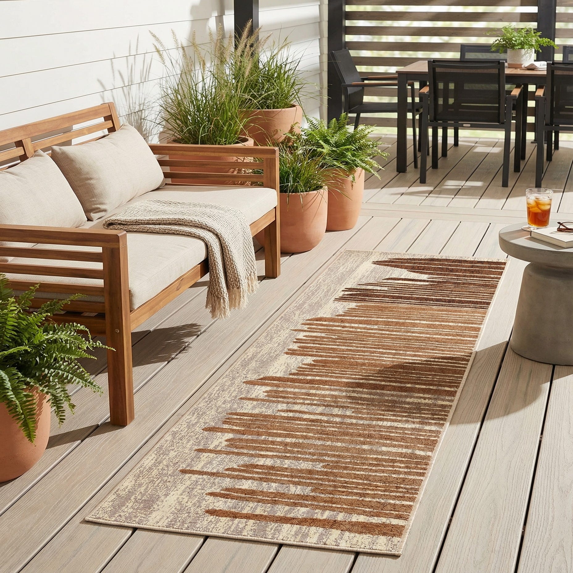 A modern 8 ft runner rug with an abstract pattern of horizontal brown and tan stripes on an ivory background, ideal for a hallway or patio.