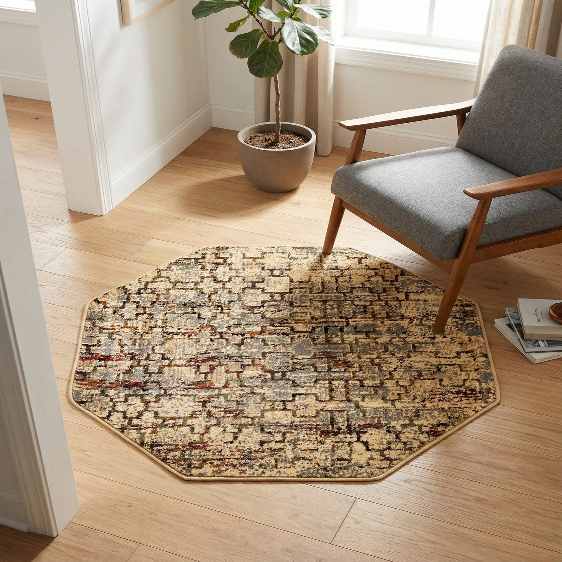 Neutral Beige Cream forms the soft backdrop for an abstract, grid-like pattern that mixes geometric fragments with painterly distressing. Interlocking lines and blocks in Black and Brown cut across fields of Gray, while touches of Gold and Red punctuate the surface for visual depth. The octagonal silhouette gives the design an unexpected shape that feels purposeful and collected rather than formal.