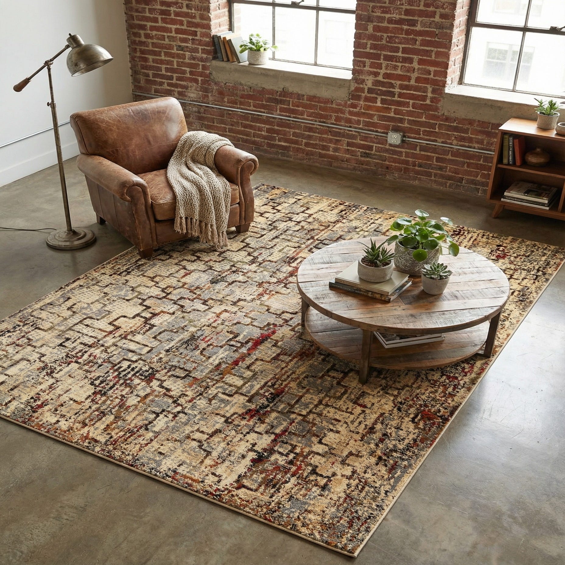 A layered, contemporary pattern combines a softened geometric trellis with painterly, distressed striations for a lived-in, textural look. The Beige Cream ground gives a warm, neutral base while interlocking shapes in beige, brown and gray create structure, and darker black outlines add definition. Flecks of red and touches of gold punctuate the surface, bringing subtle warmth and visual interest without overpowering the palette.