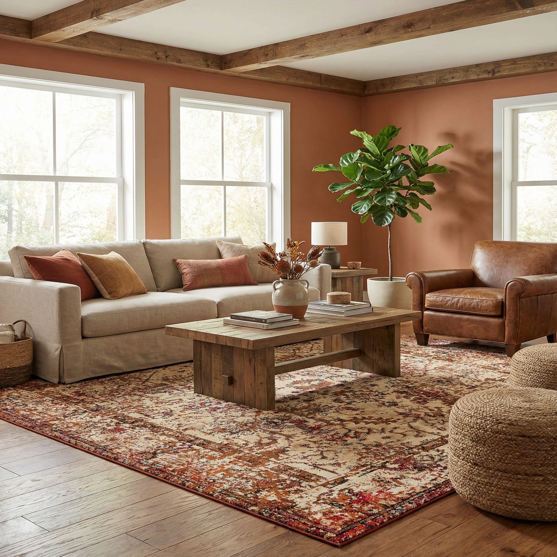 The rug’s square format makes it ideal for centering a seating group or grounding a square dining table. It pairs naturally with warm wood tones, leather sofas, and brass or matte metal accents, and fits well in transitional, modern farmhouse, or eclectic interiors where layered patterns and warm colors bring a room together. Use it to add a softened vintage look to contemporary furniture or to introduce color and pattern into a neutral living space.
