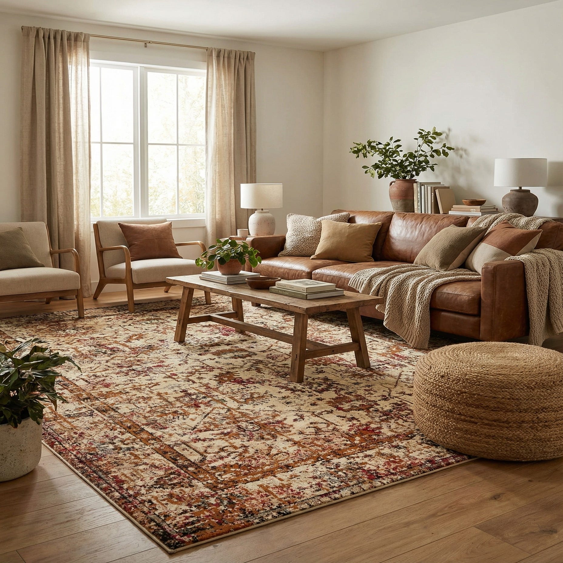Warm wood tones, leather seating and neutral linen upholstery bring out the rug’s gold and tan highlights, while darker furniture will let the black and brown accents anchor the space. Place it beneath a living room seating group to define the conversation area, under a dining table to add subtle pattern, or in a home office to soften hardwood floors. Its transitional, slightly traditional look works well in classic, rustic or eclectic interiors that favor warm, layered palettes.