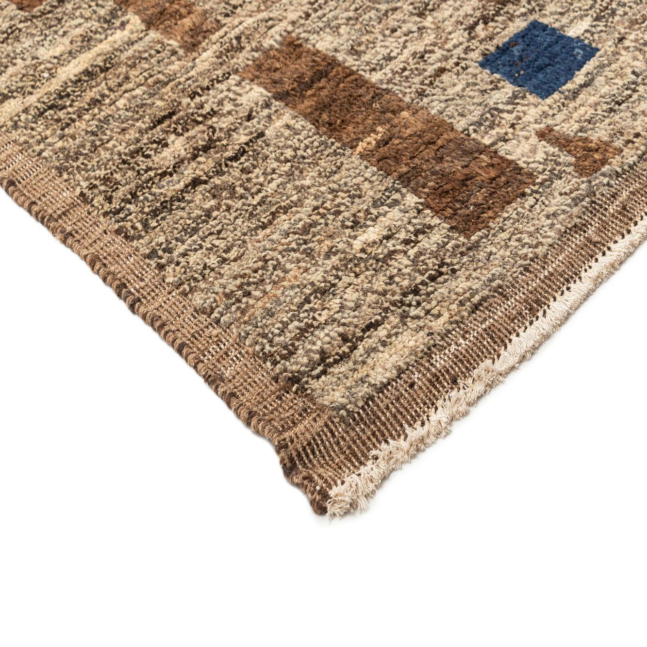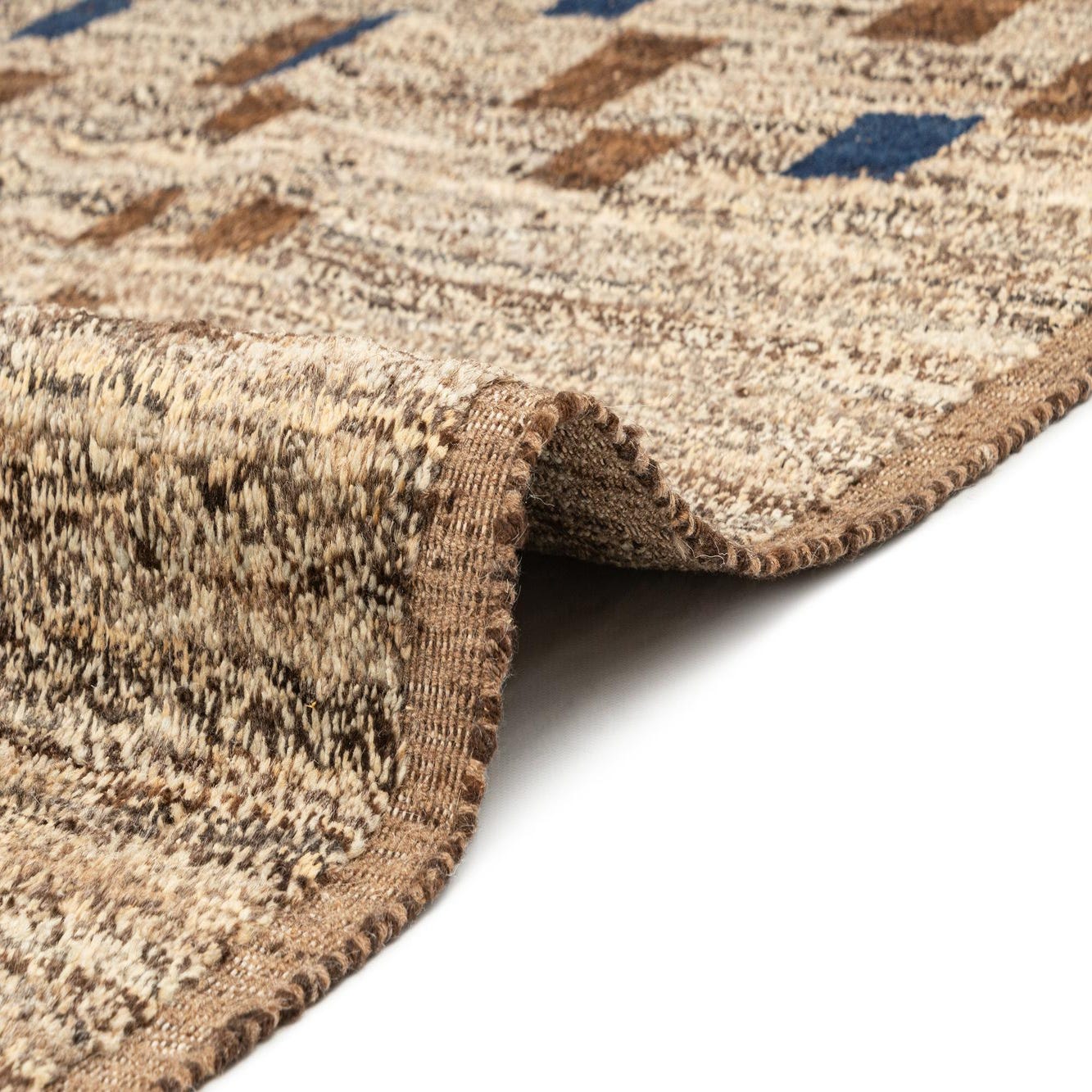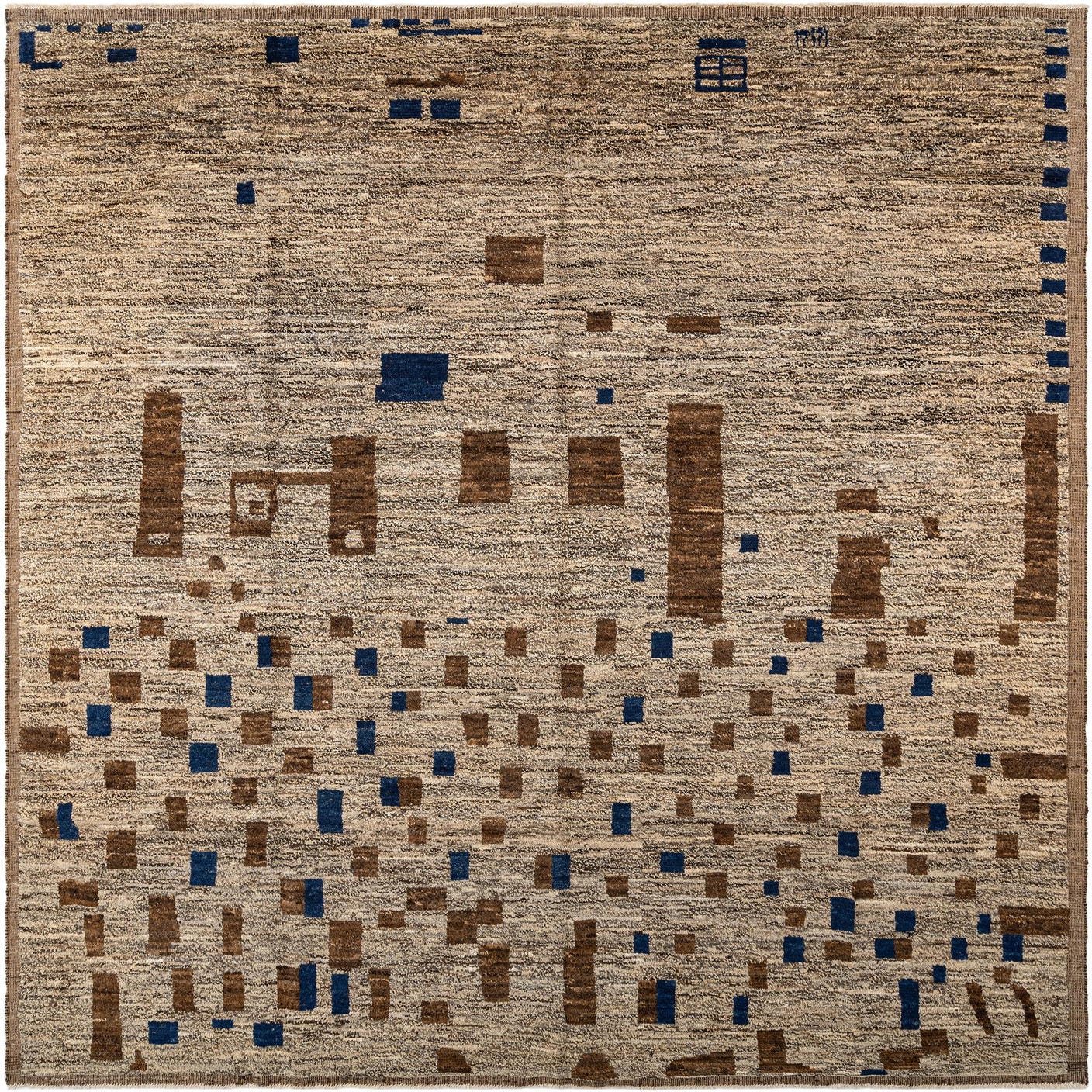 A rectangular handmade wool rug featuring a textured tan and brown background with scattered blue and brown abstract block patterns.