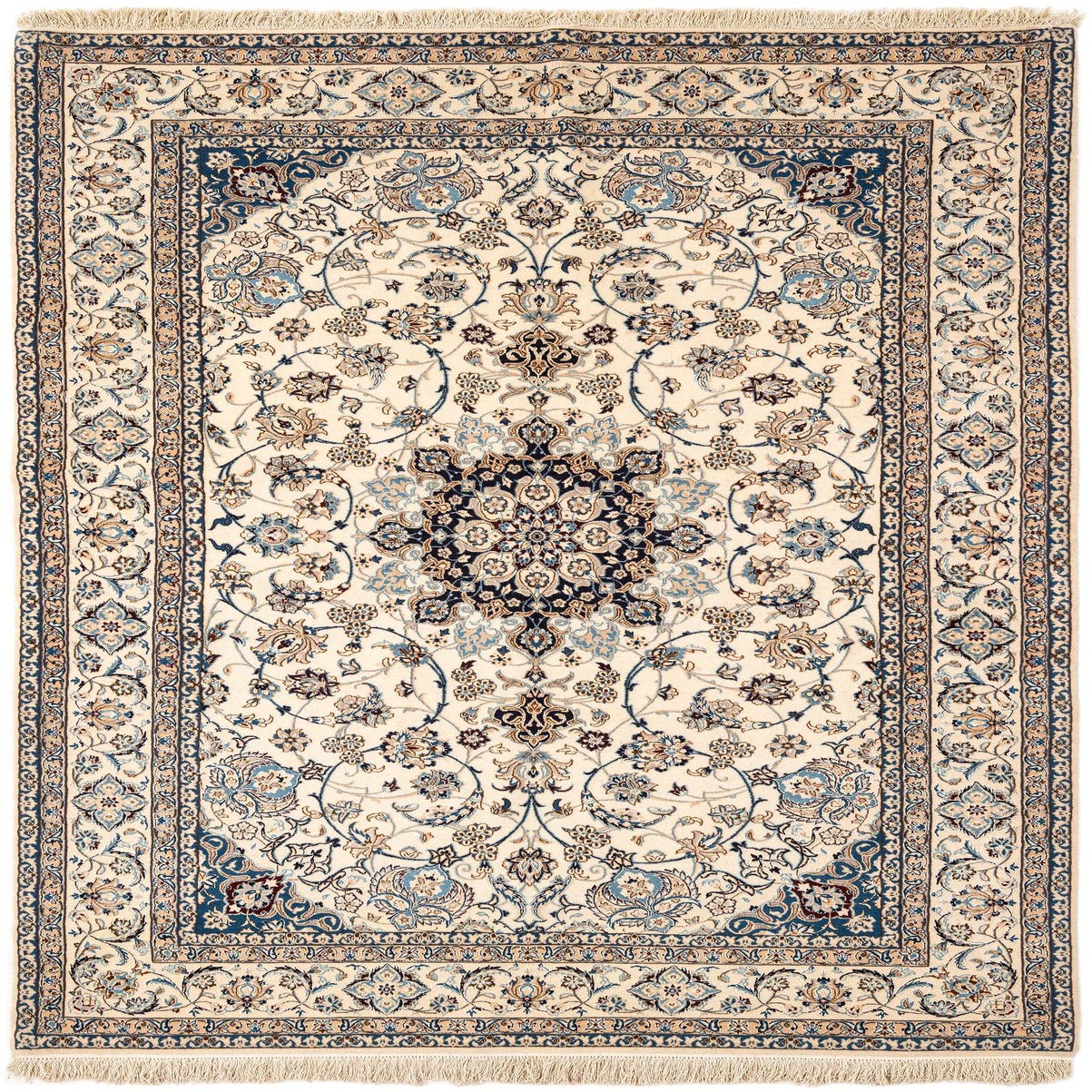 A rectangular handmade Persian rug with a cream background, intricate brown and blue floral patterns, and a detailed border.
