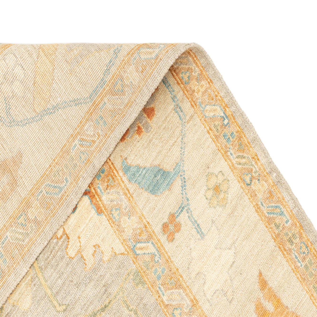 Handmade rectangular Oushak Persian rug with a light brown field and ivory border, featuring intricate floral and medallion patterns in tan, orange, and light blue.