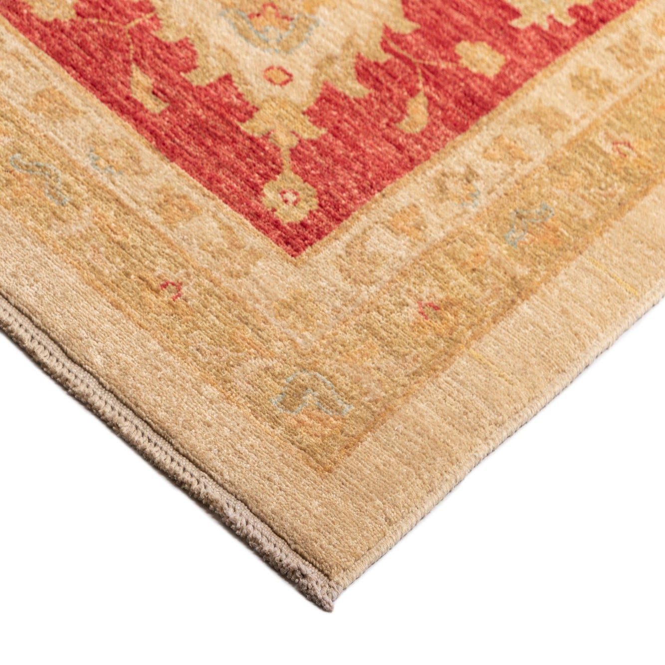 The Kaizar Collection presents a hand-made oversized wool rug that elegantly anchors any spacious room with its refined design. The rug's background is a warm beige, providing a neutral foundation that is versatile for various decorating styles. Encapsulated in the intricate pattern are additional colors such as beige, red, and cream, which create a harmonious and inviting palette. The design features a symmetrical array of floral motifs and angular vine patterns that draw inspiration from traditional carpet making.