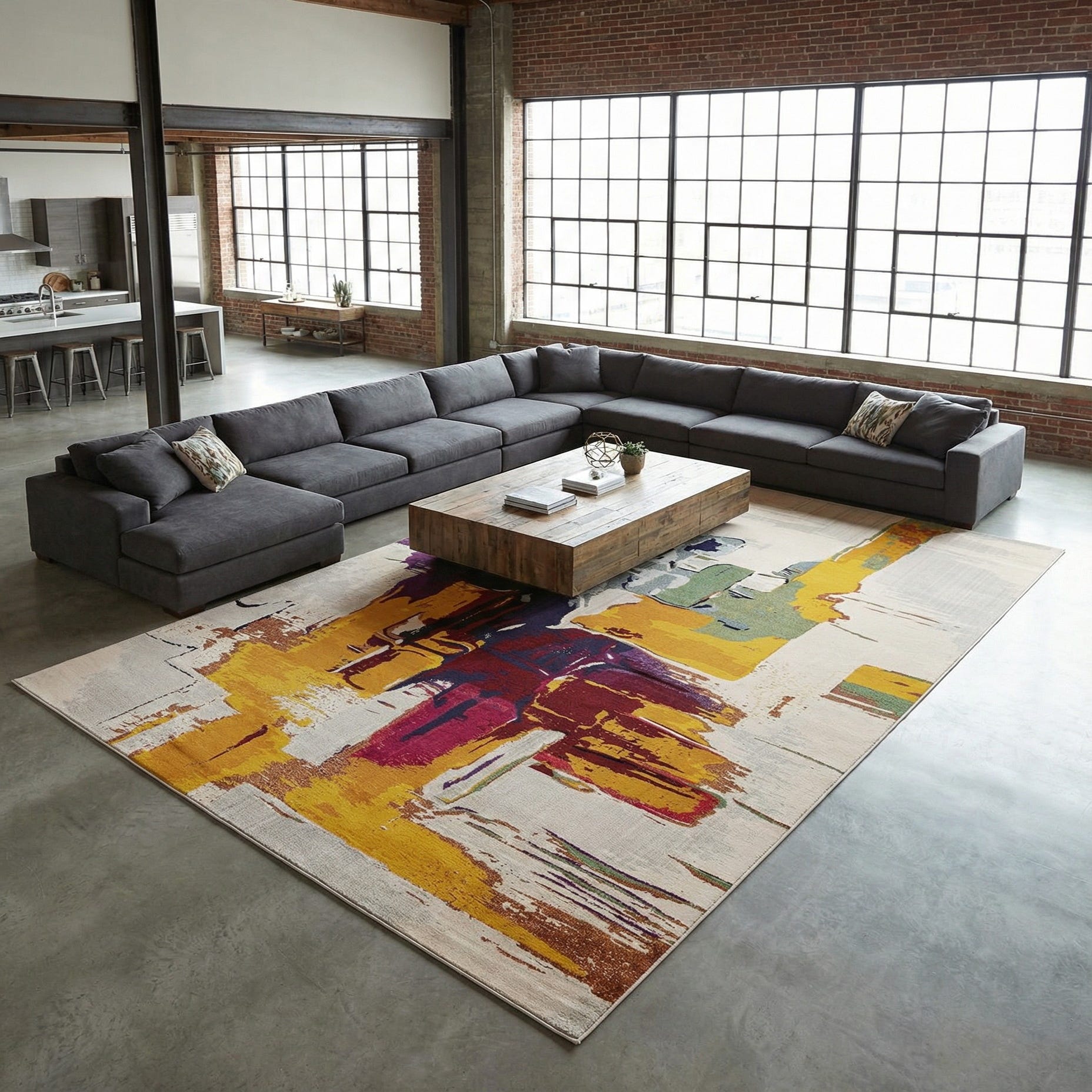 This rug works well as a focal point in a modern living room beneath a coffee table, as an accent in an eclectic loft layered with mixed textiles, or as a grounding element in a home office or dining area. Pair it with a navy or charcoal sofa to reinforce the deeper blues, or coordinate with warm wood furniture and brass or matte-black accents to highlight the orange and yellow tones. Smaller sizes define seating zones; larger formats help anchor an open-plan space.
