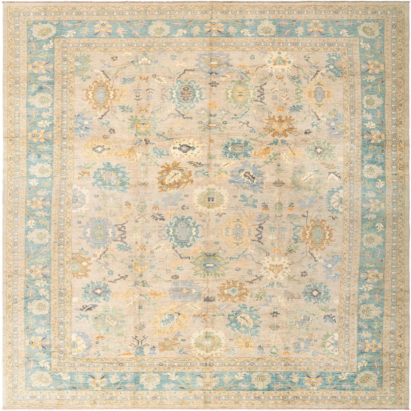 Rectangular Oushak wool rug with a light brown and ivory field, featuring traditional floral motifs in blue, gold, and green, framed by a wide teal border.