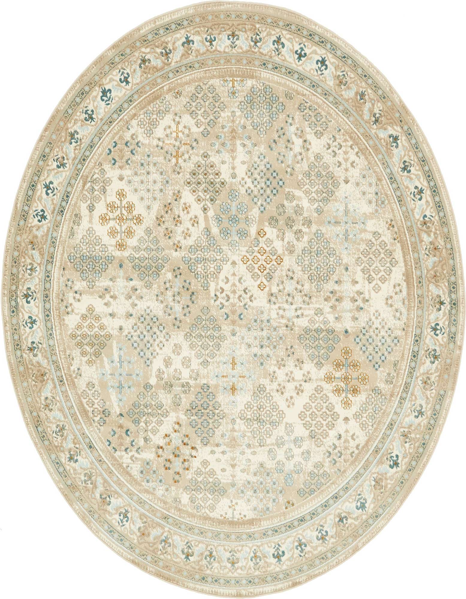 Primary color is Beige. Colors in this rug include: Beige, Gold, Teal, Light Blue, Light Brown.