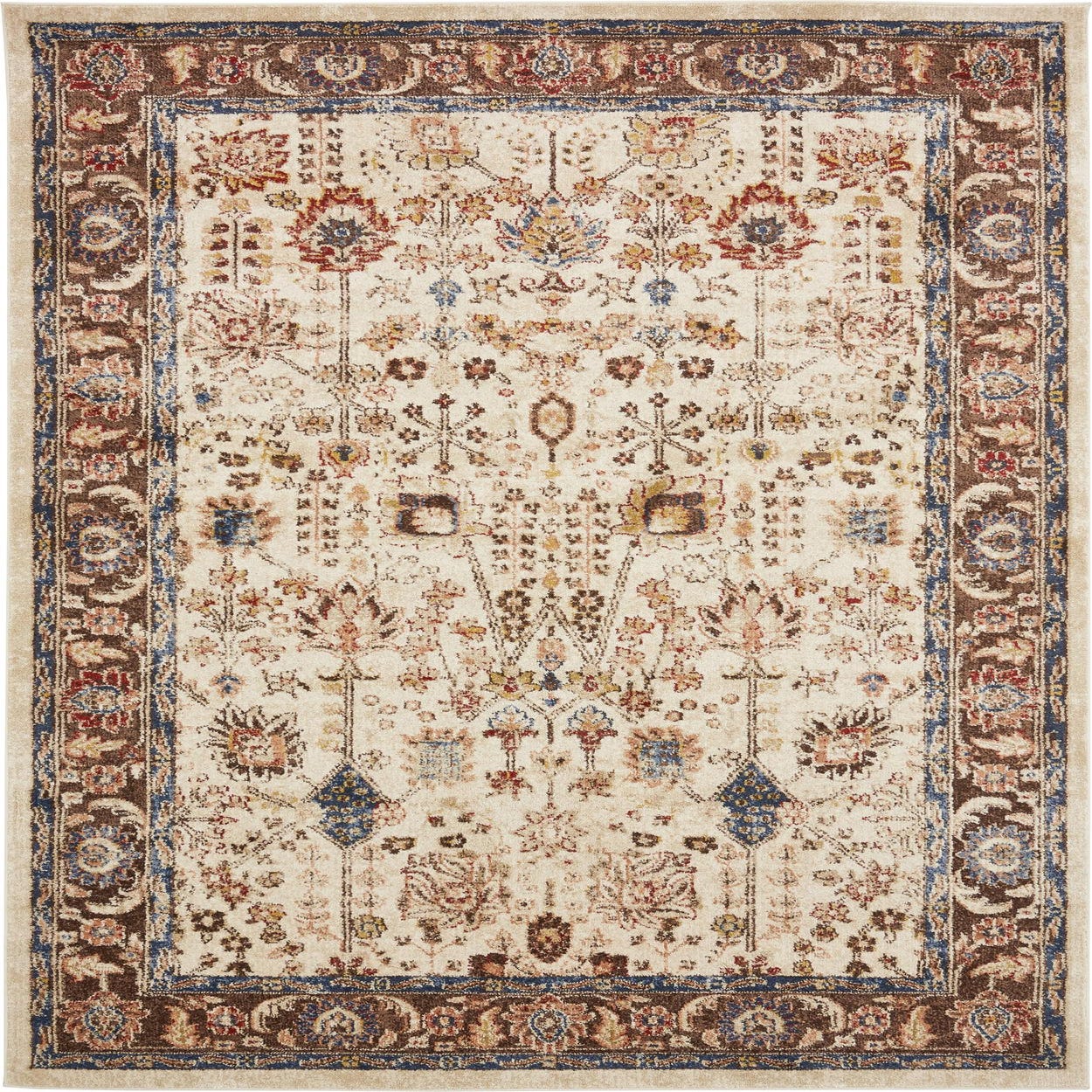 A warm beige field provides a neutral backdrop for a traditional, Persian-inspired layout of floral stems, palmettes and small medallion motifs, all enclosed by a richly patterned brown border with blue outlining. The palette mixes brown and light brown tones with tan and navy blue, plus pops of blue, burgundy and salmon that give the design measured contrast against the beige background. Machine made of 100% polypropylene, the rug has a low-to-medium pile with a dense, smooth hand and a deliberate antique-distressed finish that adds visual texture without high loft. This piece is a sample.