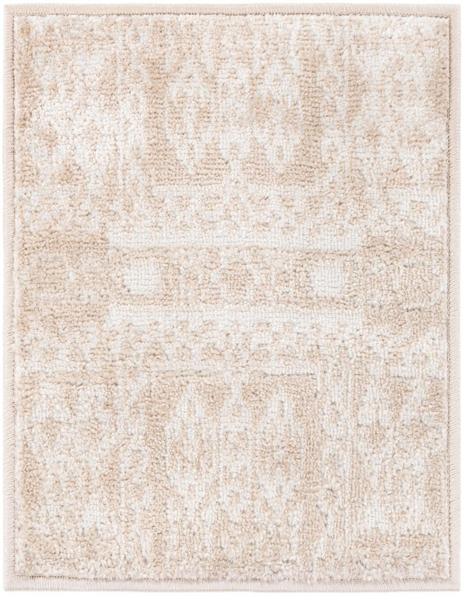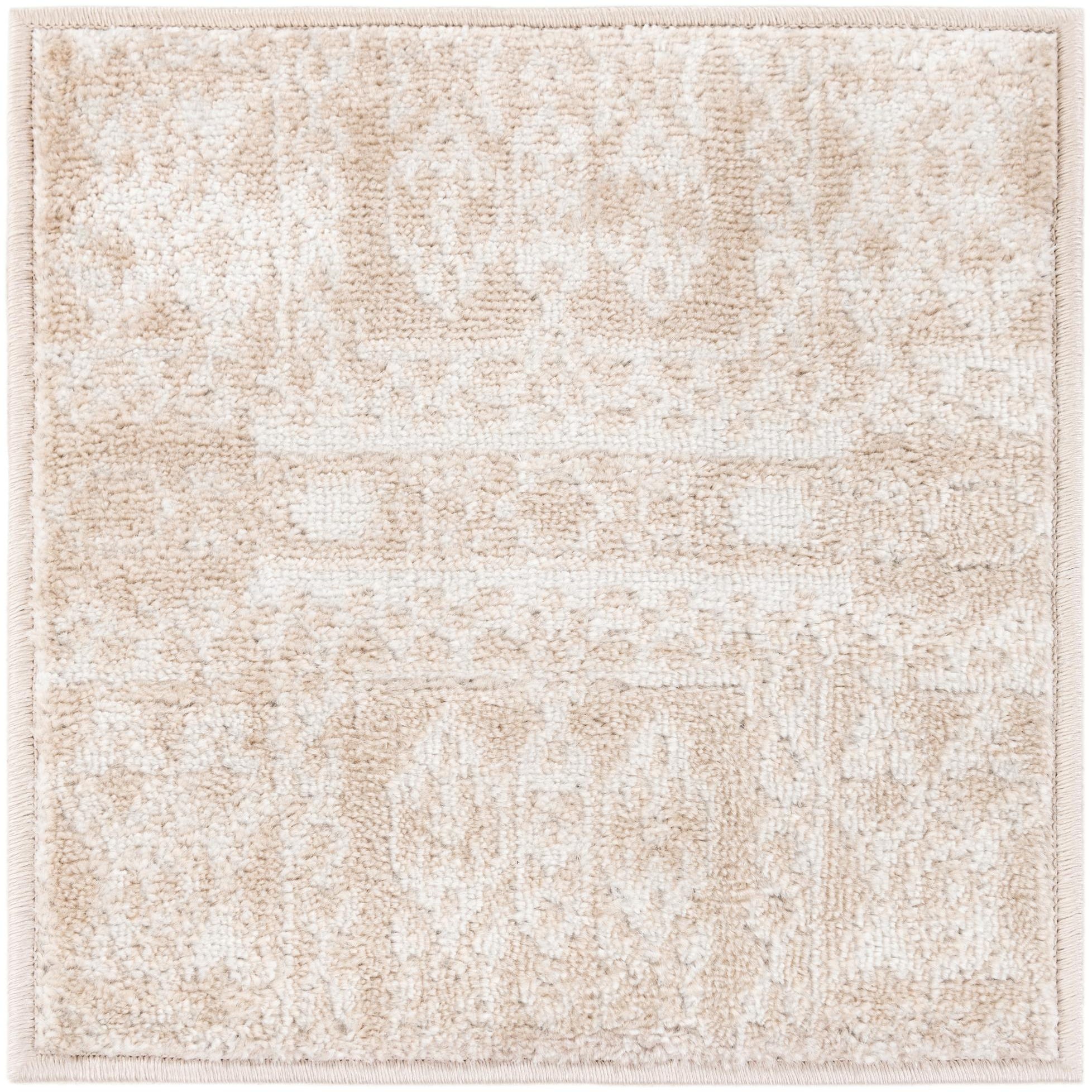 A close-up view of a 1' 4 x 1' 4 rectangular rug sample in varying shades of cream and tan, featuring a subtle distressed bohemian pattern.