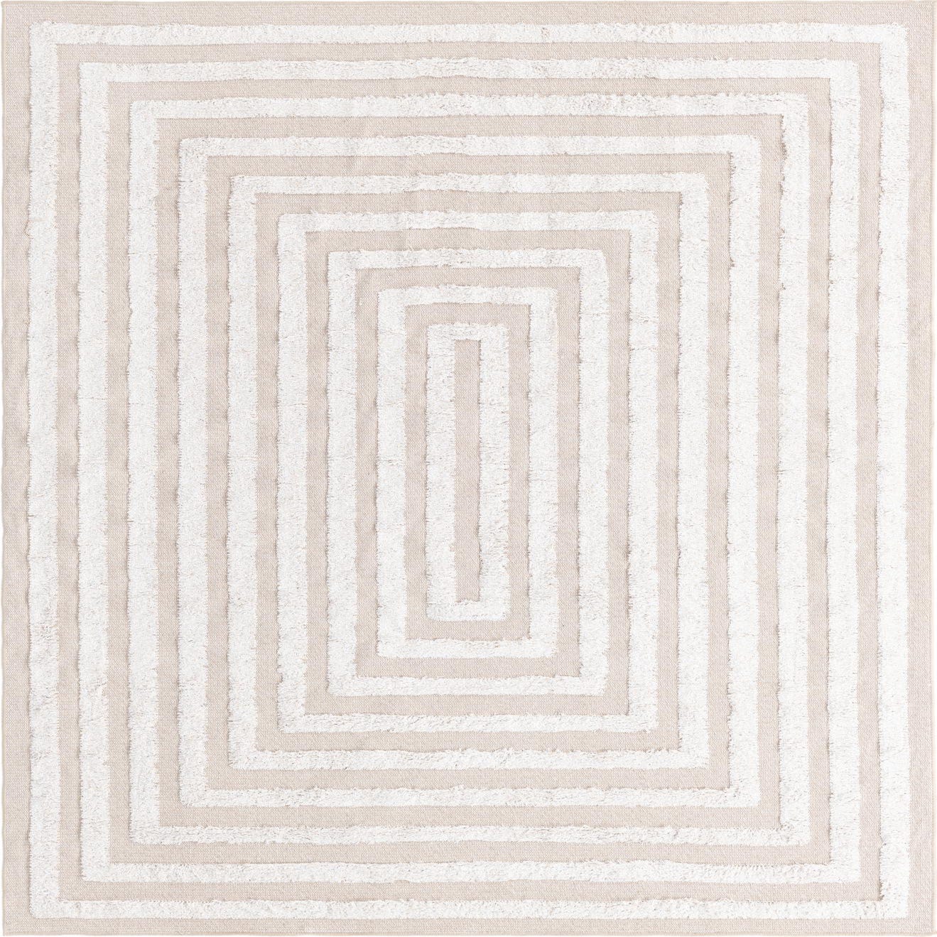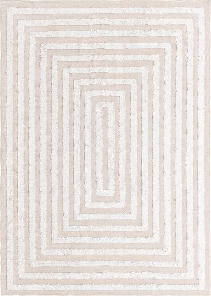 A soft beige field provides a calm, neutral backdrop for a bold linear motif of concentric rectangles in warm ivory. The pattern is defined by raised, textured bands that form a stepped, geometric maze across the surface, creating visual depth without heavy contrast. The interplay between the low-profile beige ground and the higher ivory stripes gives a tactile quality you can feel underfoot; the rug is machine-made from 100% cotton and presented here as a sample.
