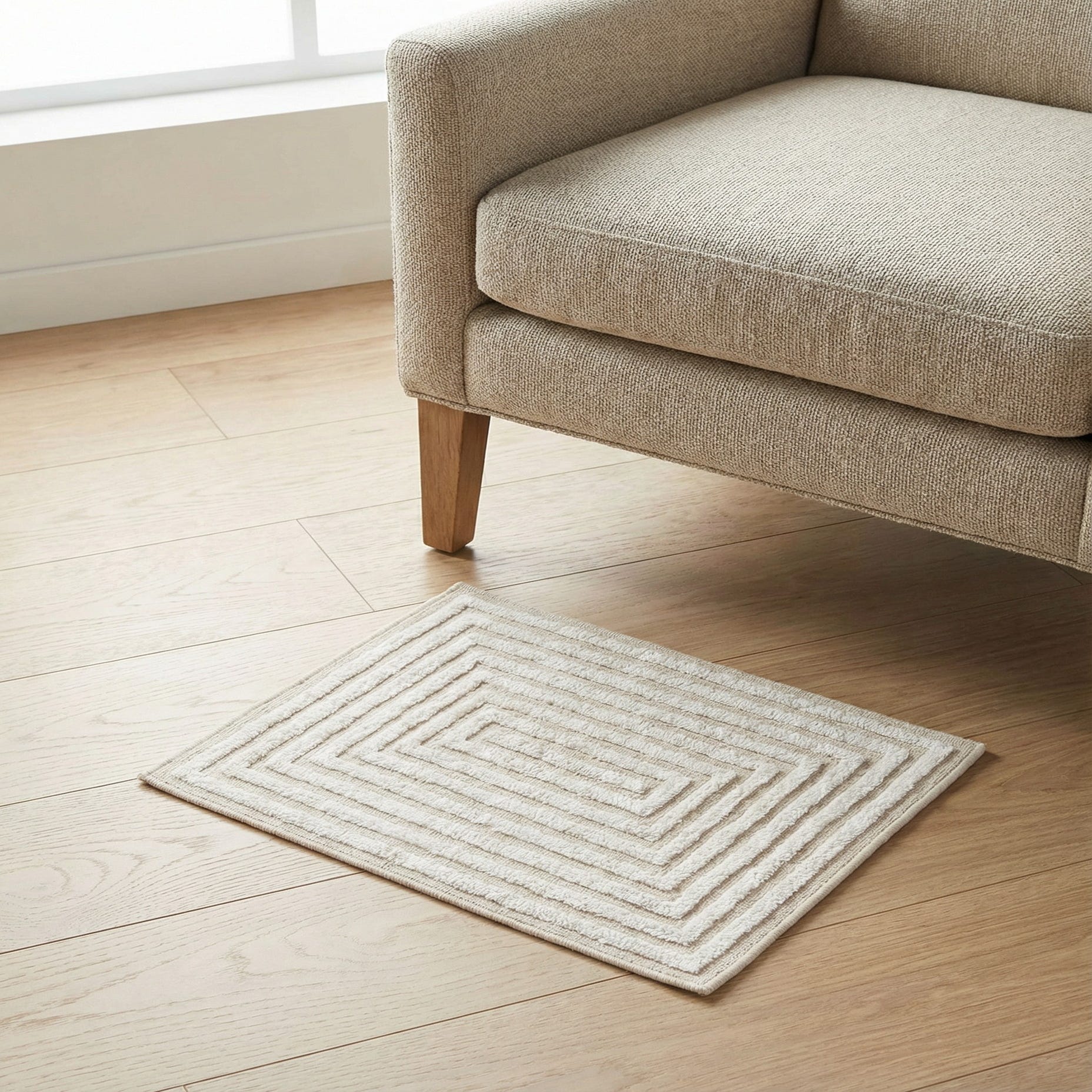 This rug works well in contemporary and transitional interiors where a subtle geometric statement is needed—place it under a low coffee table to anchor a living room with light wood tones, or layer it in a serene bedroom to complement linen bedding and soft neutrals. It also pairs nicely with Scandinavian and coastal-inspired schemes, acting as a quiet, textural foundation for natural materials and minimalist furnishings.