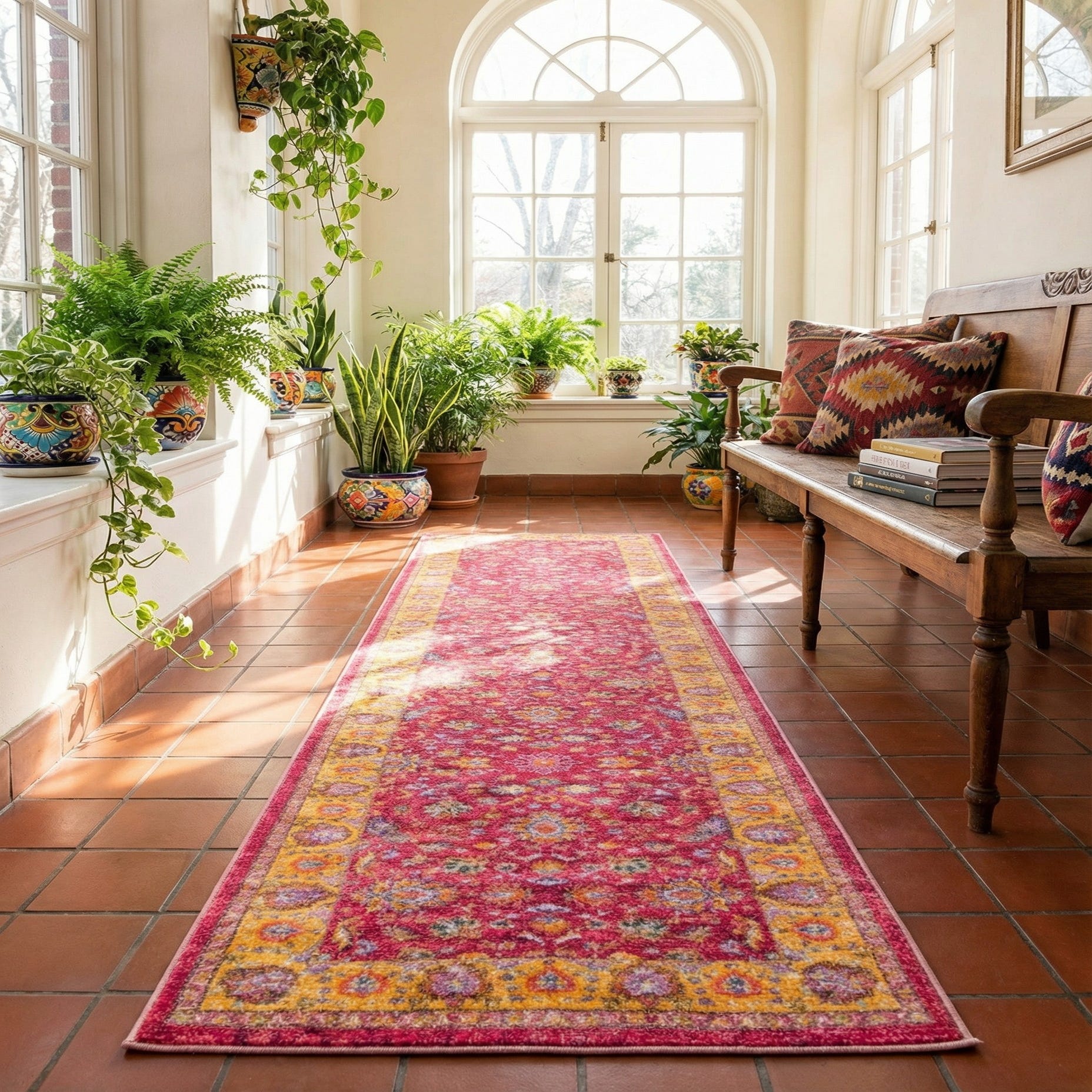 A lively floral medallion pattern fills the length of this runner, set on a warm berry pink ground that anchors the design. A golden-yellow border frames the central field, punctuated by accents of blue, ivory and violet that form repeating blossoms and scrolling motifs. Machine-made from polyester, the rug has a low, even pile with a smooth, slightly plush surface that feels soft underfoot while keeping the pattern definition crisp and clear.