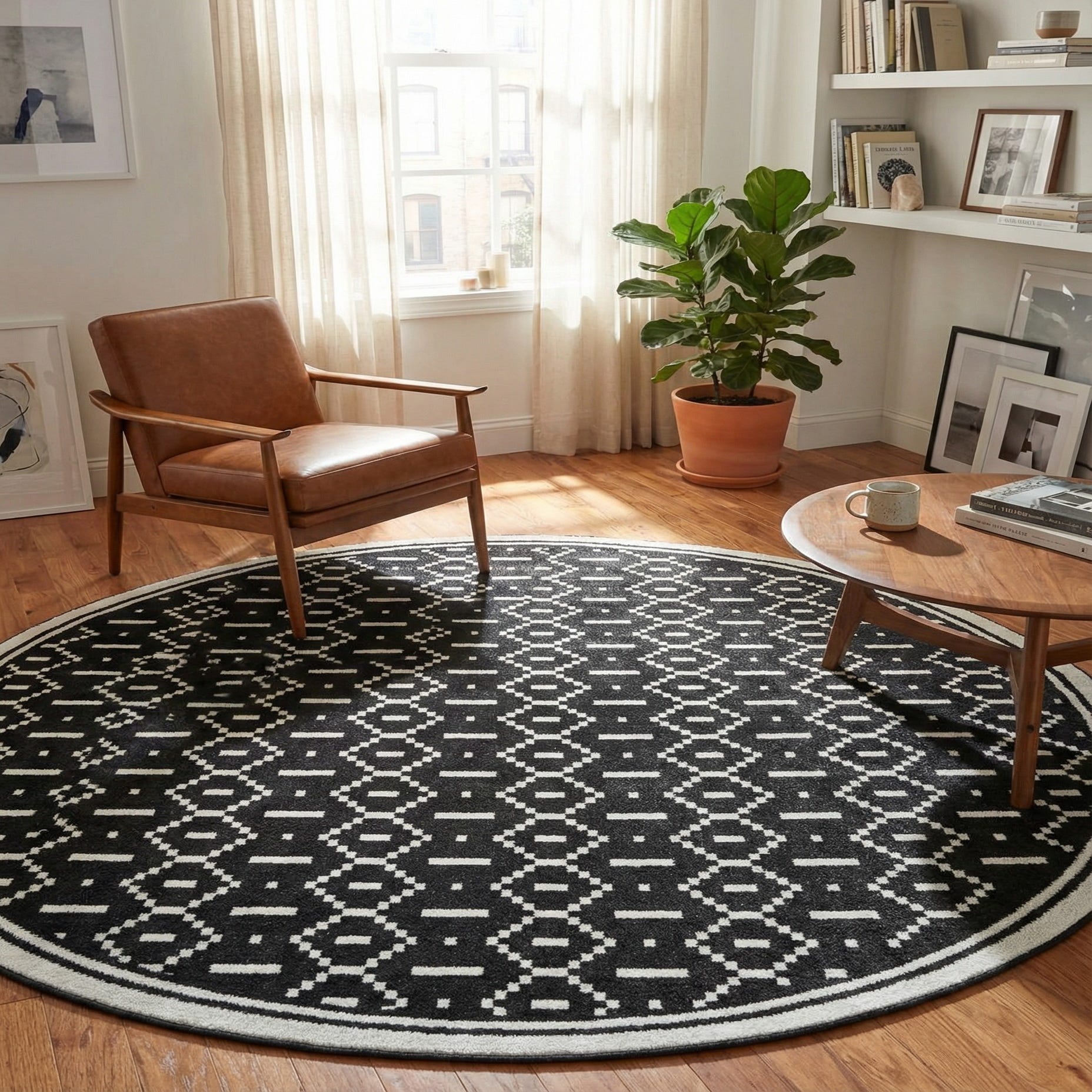 A 10-foot round black rug with a modern geometric pattern of white diamonds and dashes, featuring a thin white border.