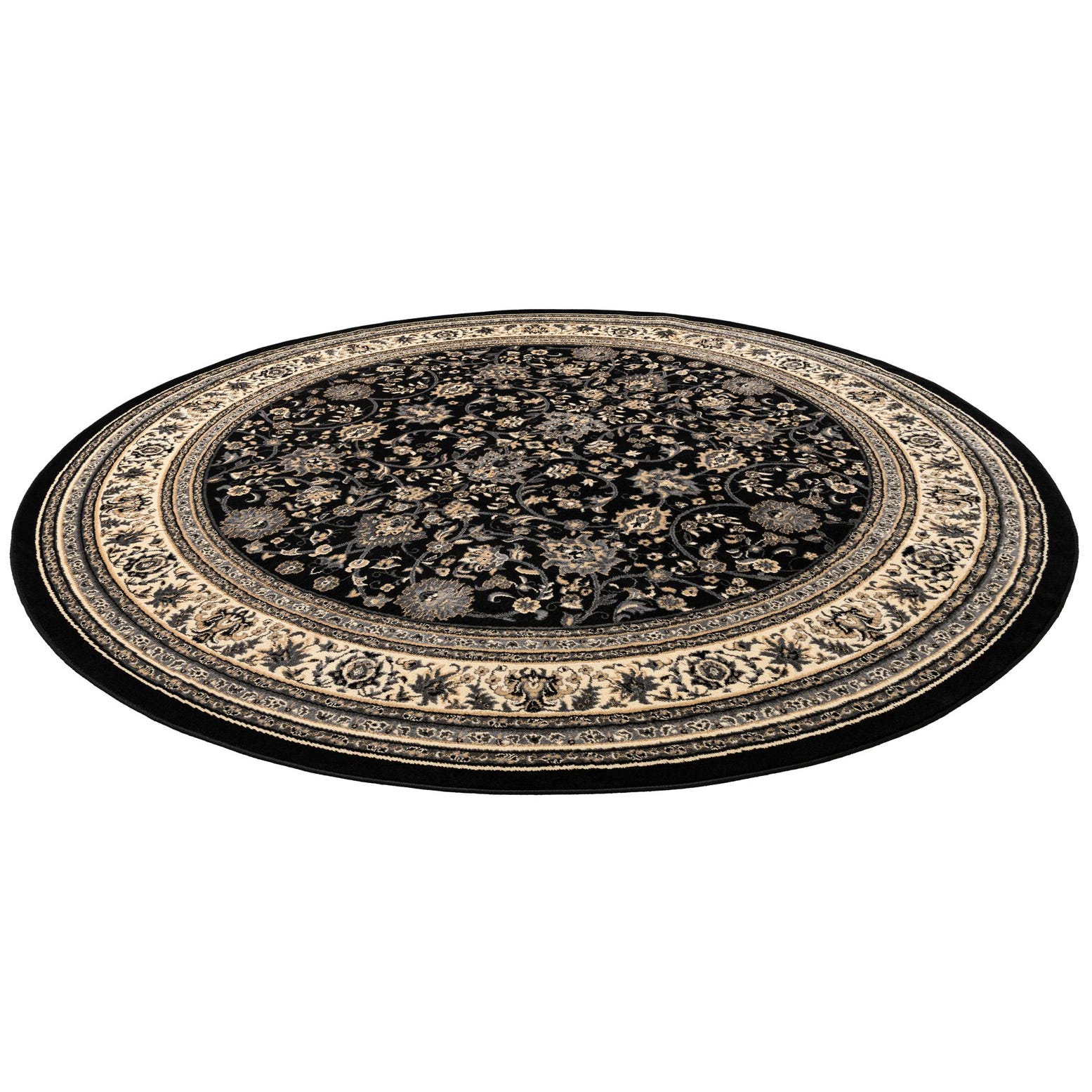 The Yasmin Collection offers a Machine Woven rug in a 10 Ft Round size, crafted from 100% Polypropylene fibers for durability and ease of maintenance. This rug features a rich, black background that sets the stage for an intricate pattern of florals and vines in contrasting shades of gray, ivory, and tan. The design is detailed and symmetrical, evoking a sense of traditional elegance while the play of colors gives it a modern edge.