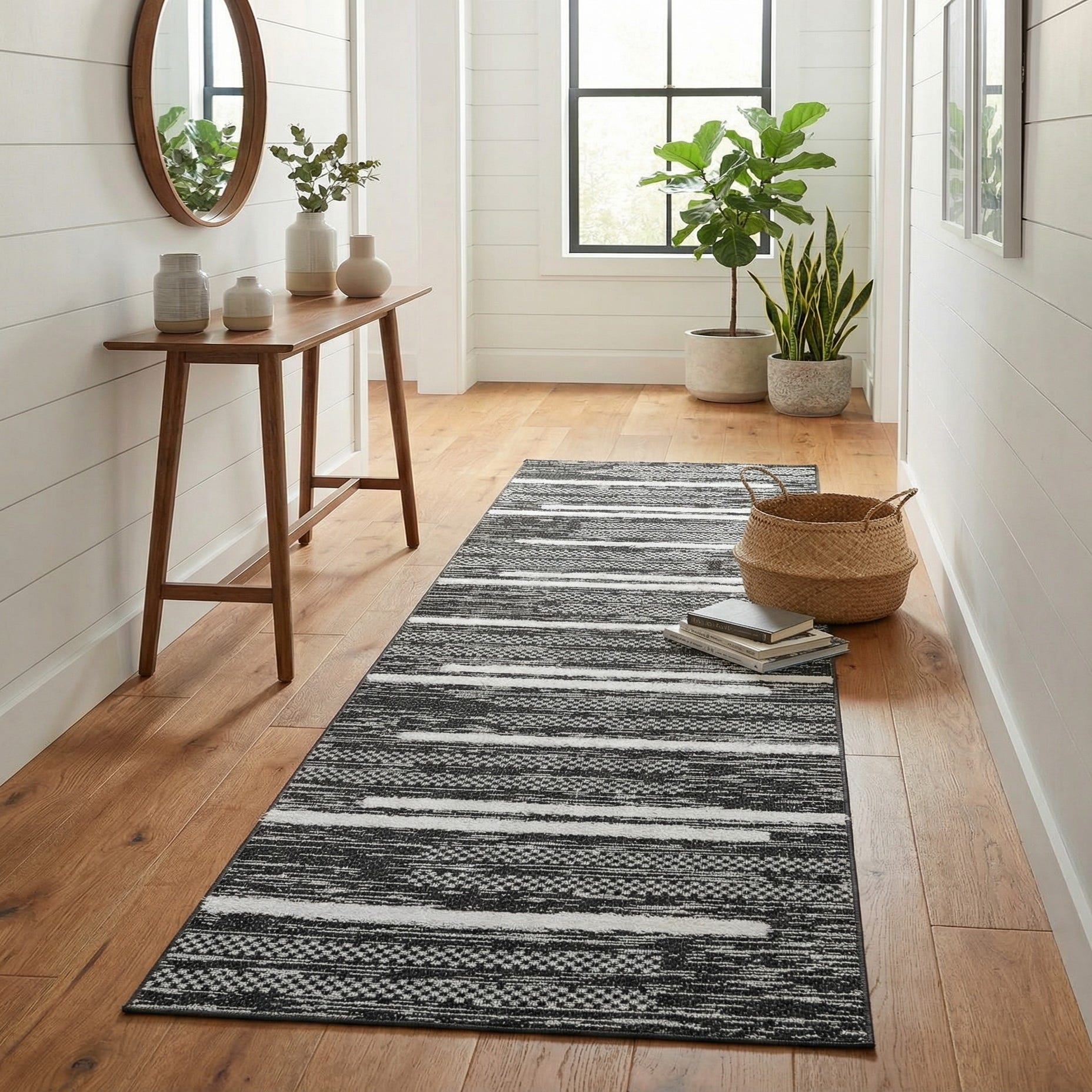 A 10 ft runner rug featuring a modern black and white striped pattern with varied textures, ideal for a hallway.
