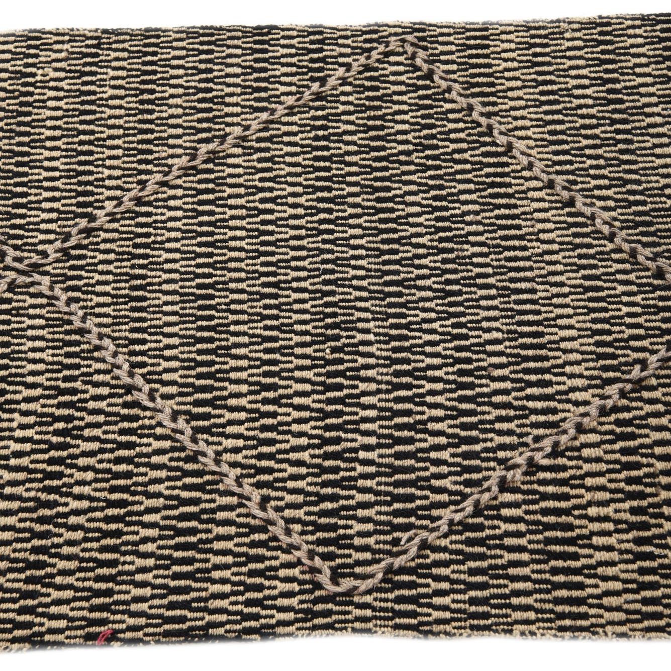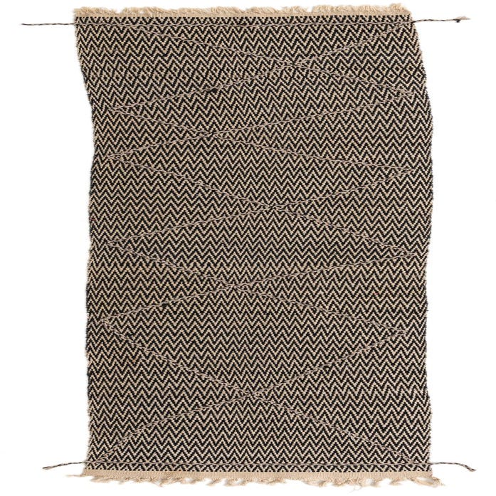The edges of the rug display an elegant fringe detail that adds a classic touch to its contemporary aesthetic. The overall texture of the piece is inviting and warm, which can complement a variety of design scenarios. This rug would seamlessly integrate into a modern minimalist setting, where its bold pattern can serve as a focal point, or it would equally suit a more traditional space that favors timeless patterns and robust materials. Its durability also makes it suitable for high-traffic areas in the home or in a professional setting.