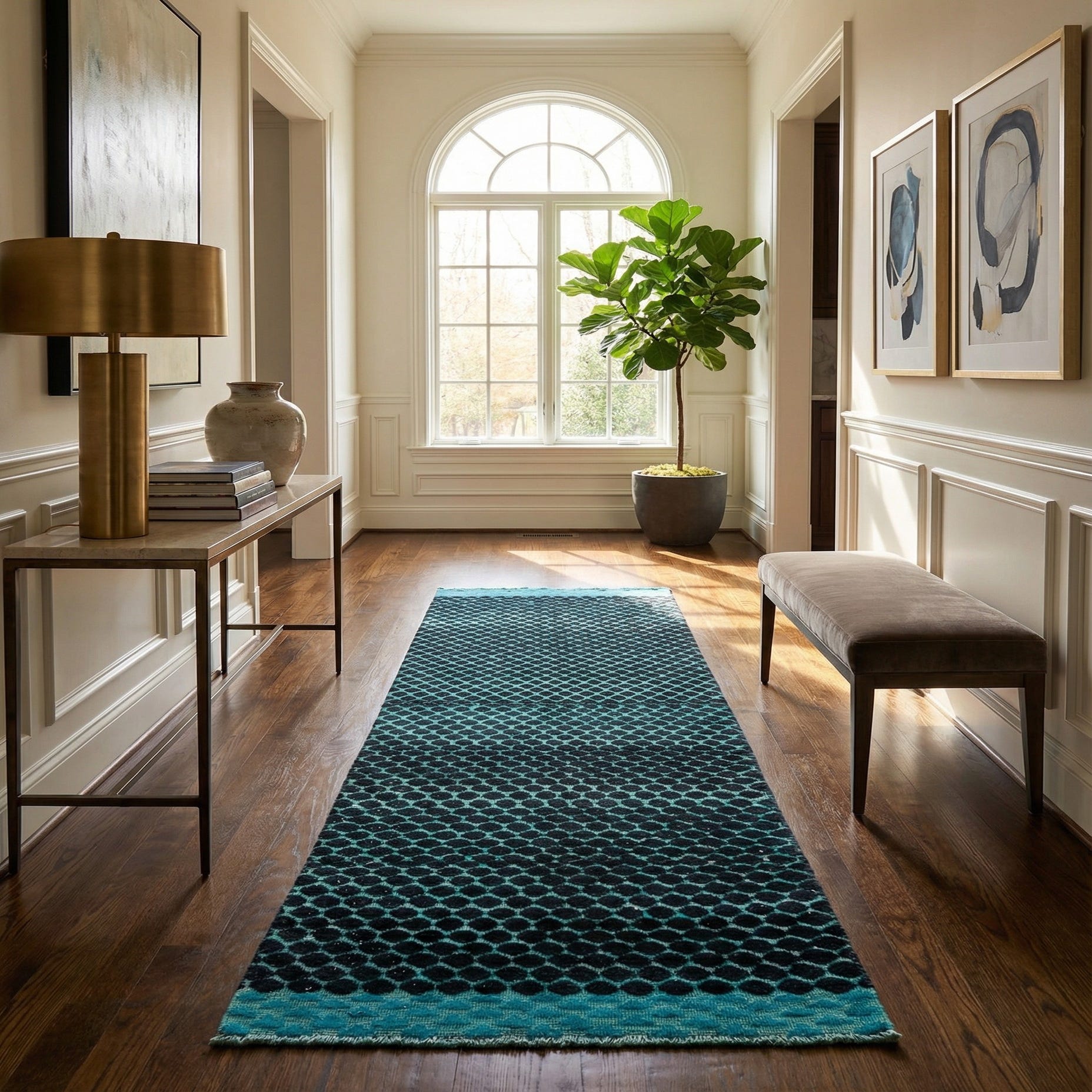 The Darya collection presents a 10-foot runner rug, hand-knotted from 100% wool, offering depth and durability. Boasting a bold, geometric lattice pattern, the design showcases a striking contrast with turquoise lines crisply standing out against the stark black background, creating an eye-catching visual statement. The texture encompasses the natural softness and warmth characteristic of fine wool, which provides tactile comfort underfoot.
