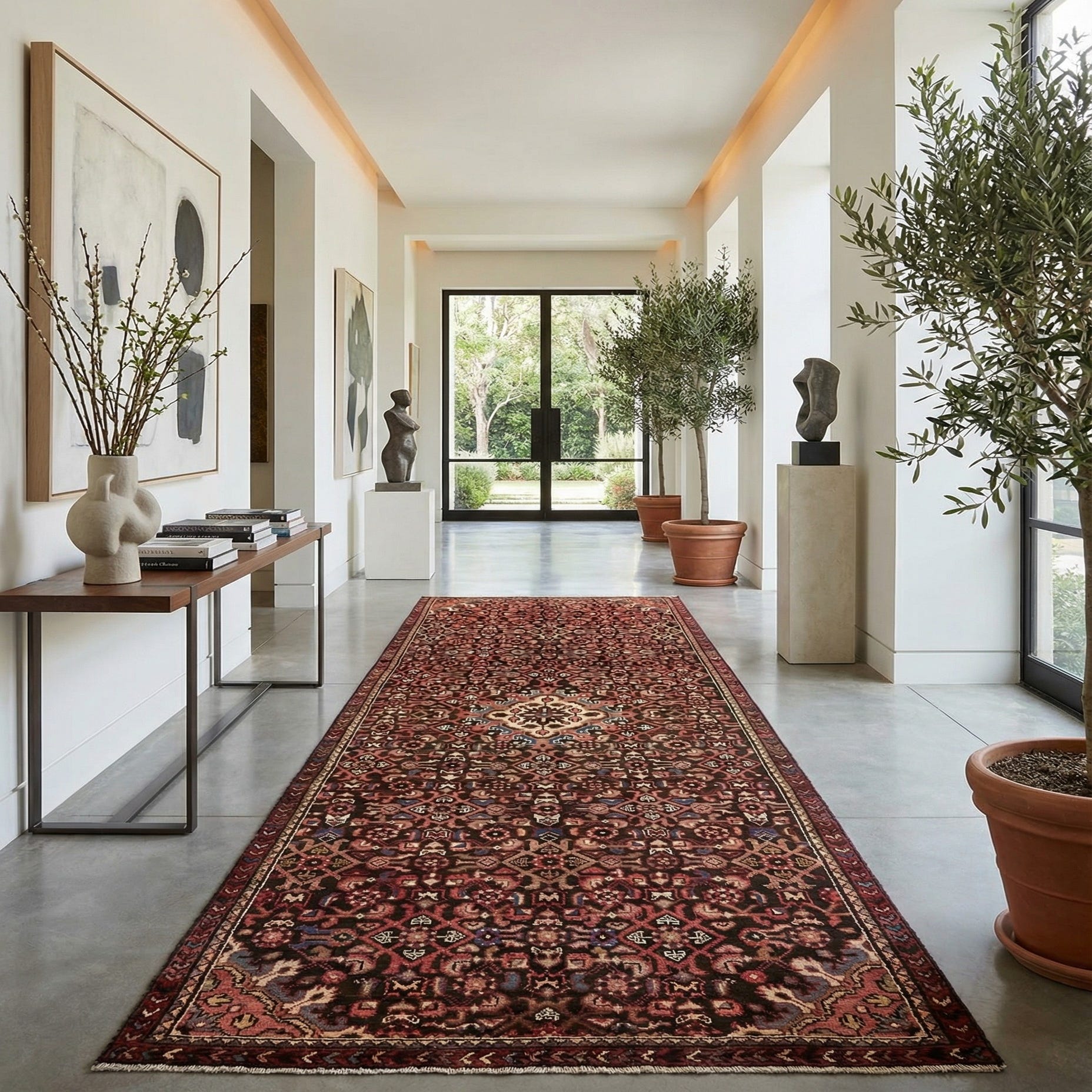 A 10 ft runner rug in black with intricate botanical and tribal patterns in red, blue, and cream, ideal for a hallway.