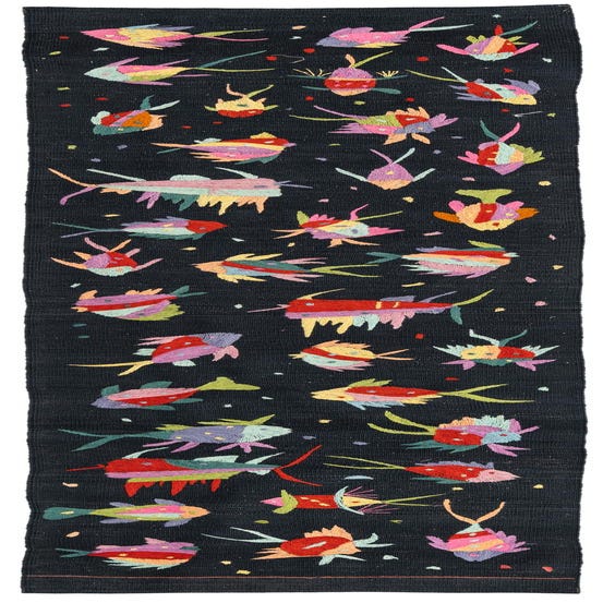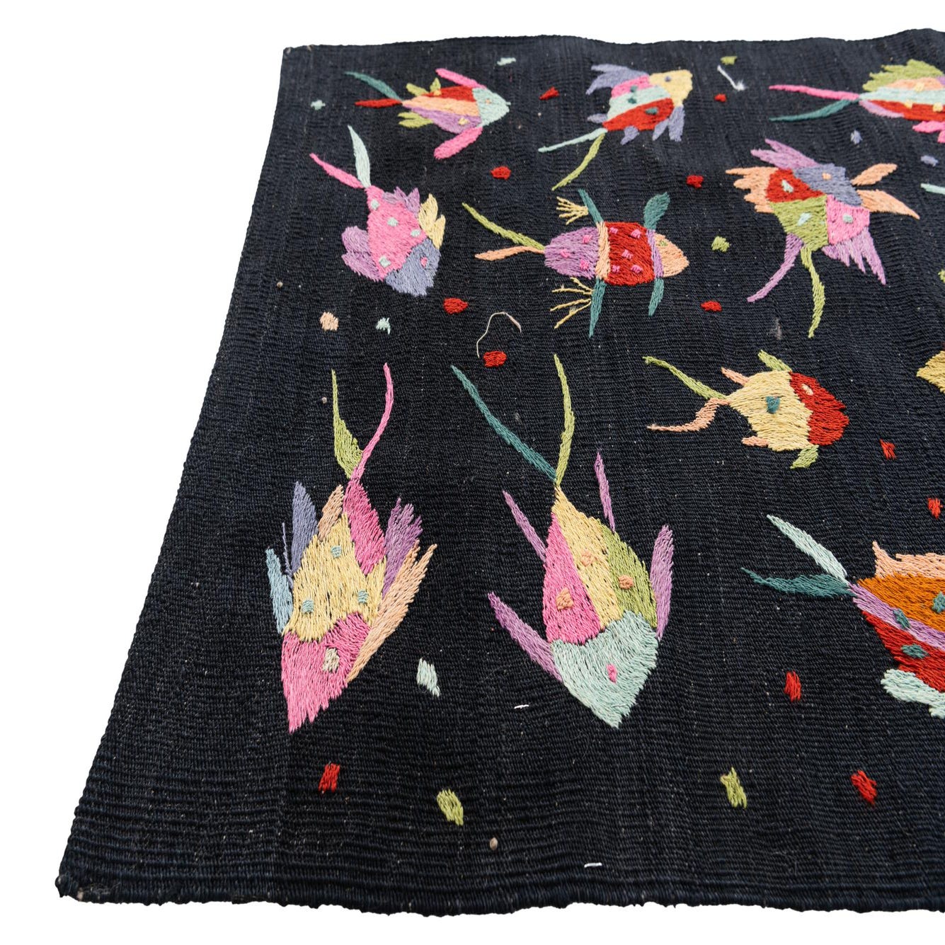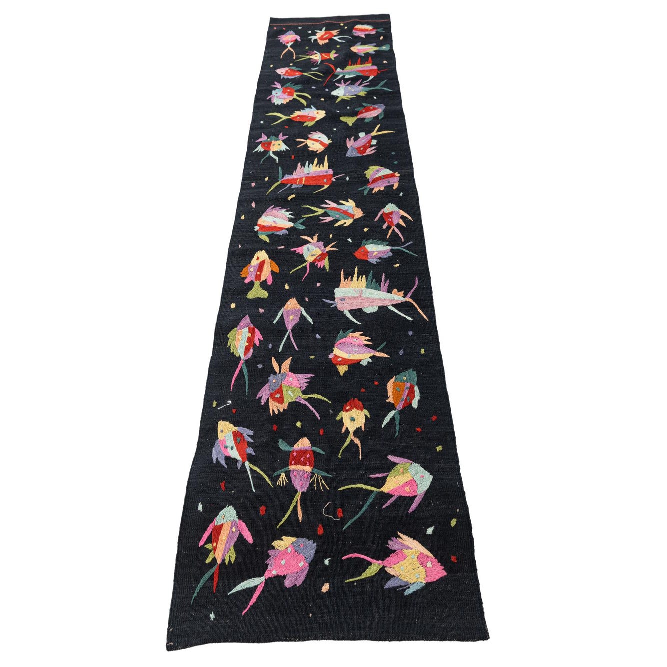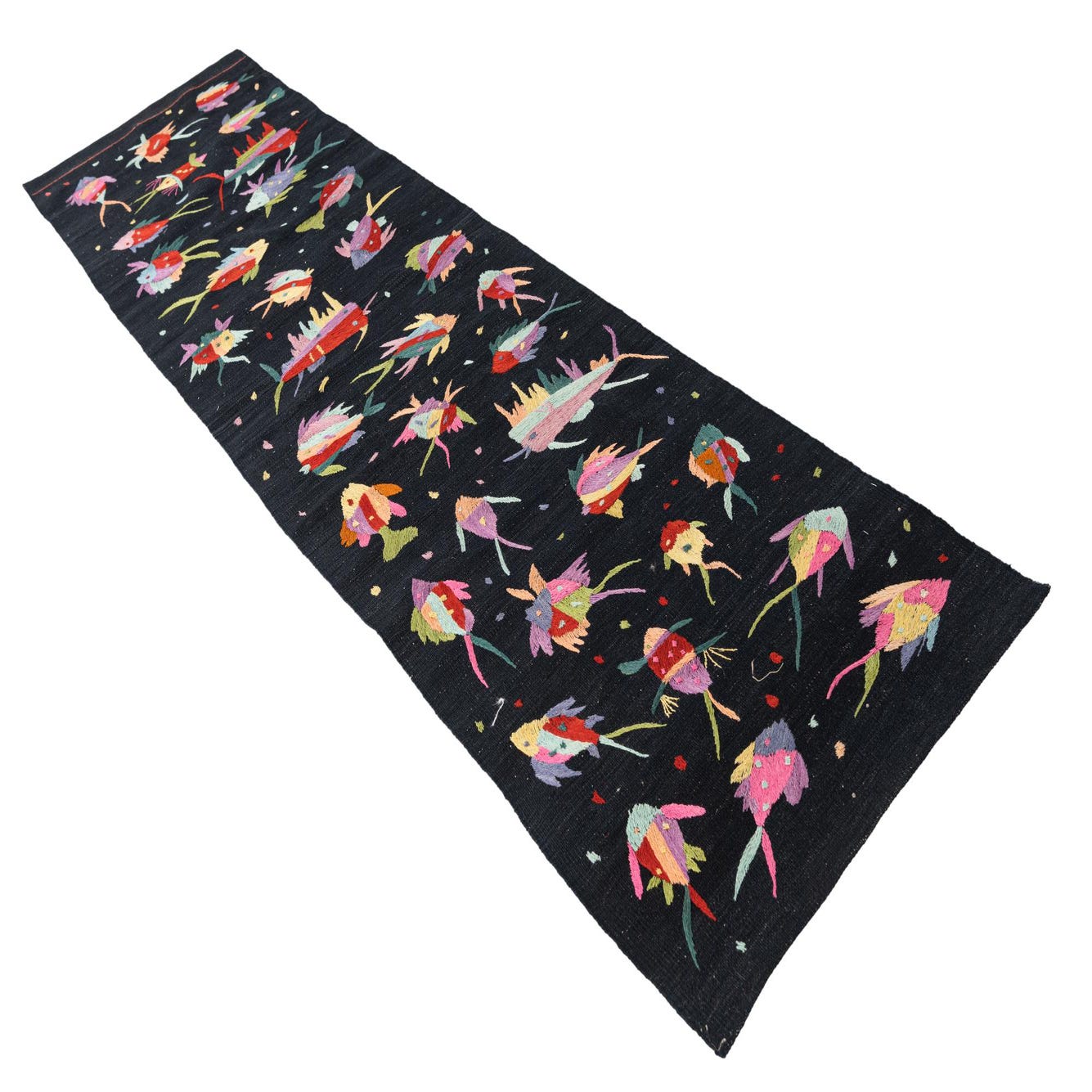A black 10 Ft Kilim Suzani runner rug with vibrant, multi-colored embroidered fish patterns, ideal for a hallway.