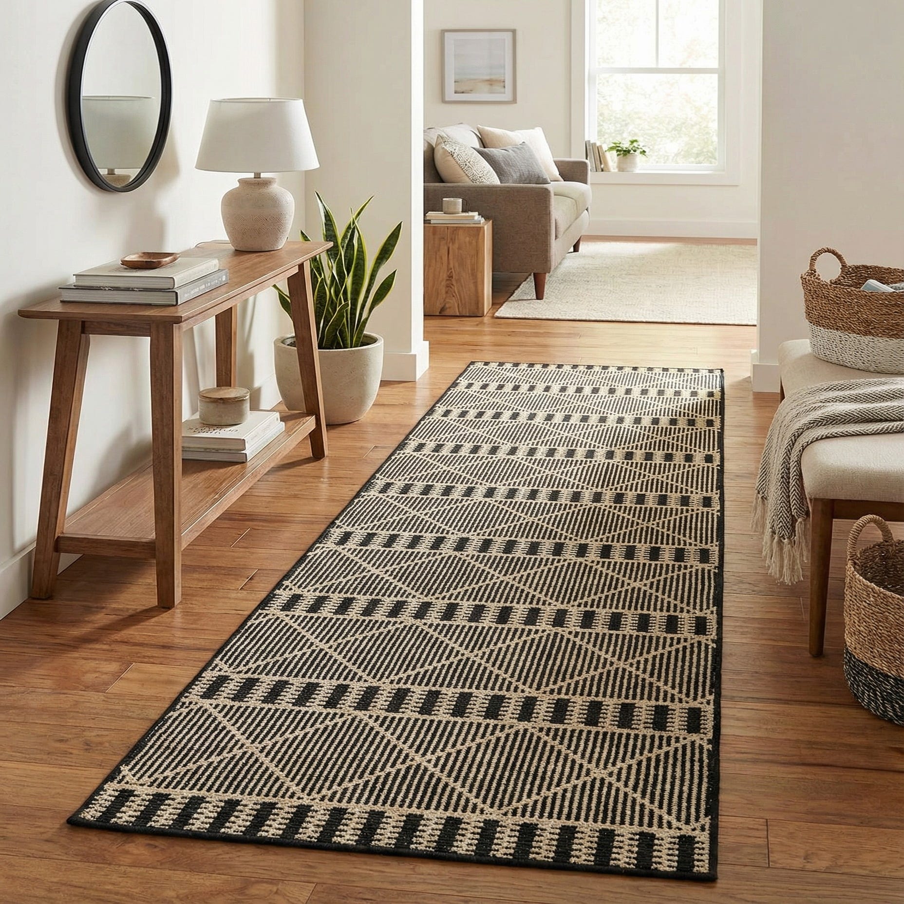 A 10 ft runner rug in black and cream with a modern trellis pattern, suitable for a hallway or patio.