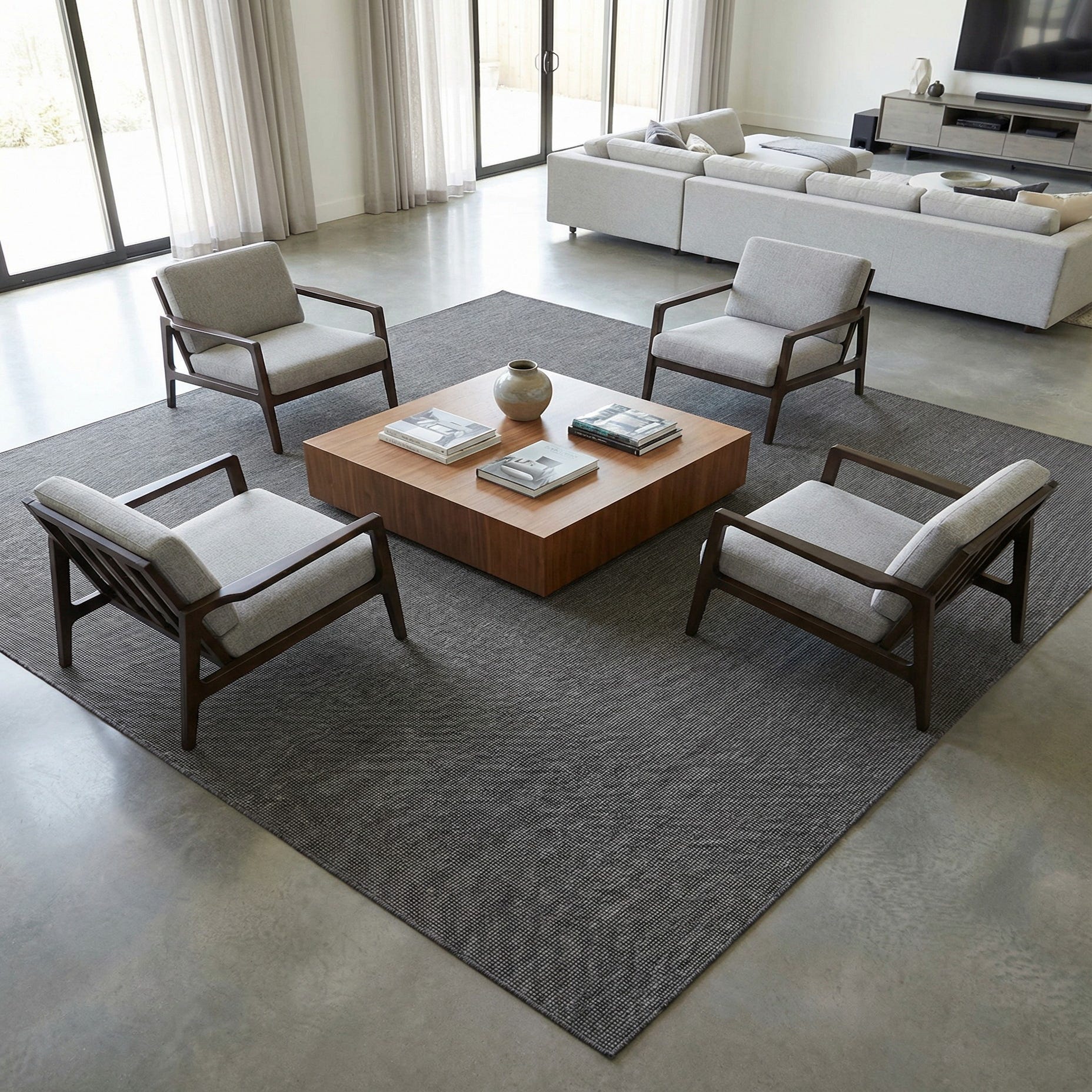 This rug works well in covered outdoor seating, a sunroom, or high-traffic interior spaces where a streamlined, modern texture is preferred. Pair it with light wood or black metal furniture for a contemporary palette, layer it under a dining table to anchor a minimalist dining room, or place it in an entry or mudroom where a simple, neutral ground complements woven, rattan, or concrete elements. The understated pattern supports both bold accent colors and a calm, monochrome scheme.
