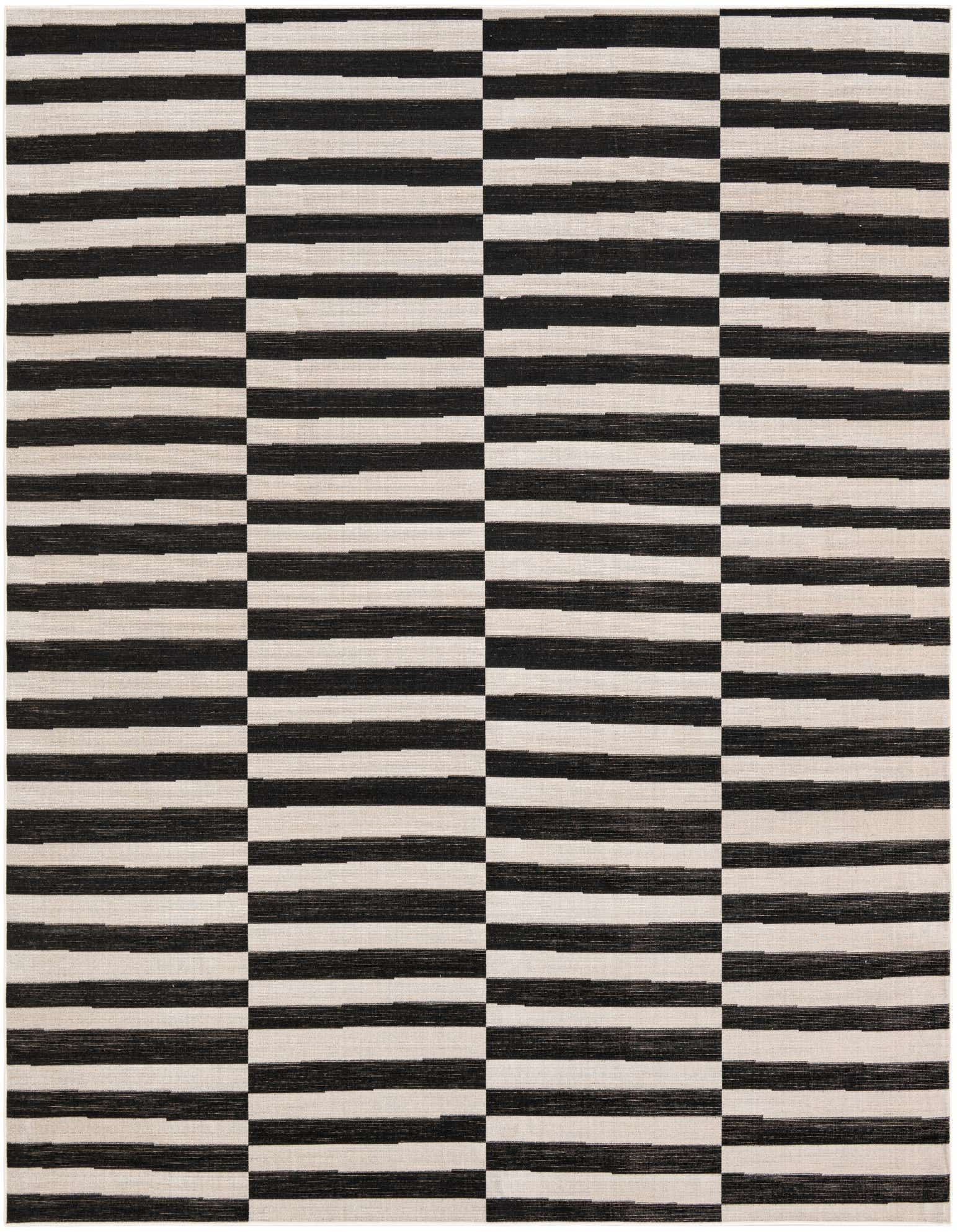 This SoHo Collection rug features a bold striped pattern, with alternating black and ivory bands creating a striking contrast that is both modern and sophisticated. The pattern is dynamic yet unobtrusive, offering a sense of structure to any space. Crafted from 100% polypropylene, the rug is designed for durability and longevity, perfect for high-traffic areas.
