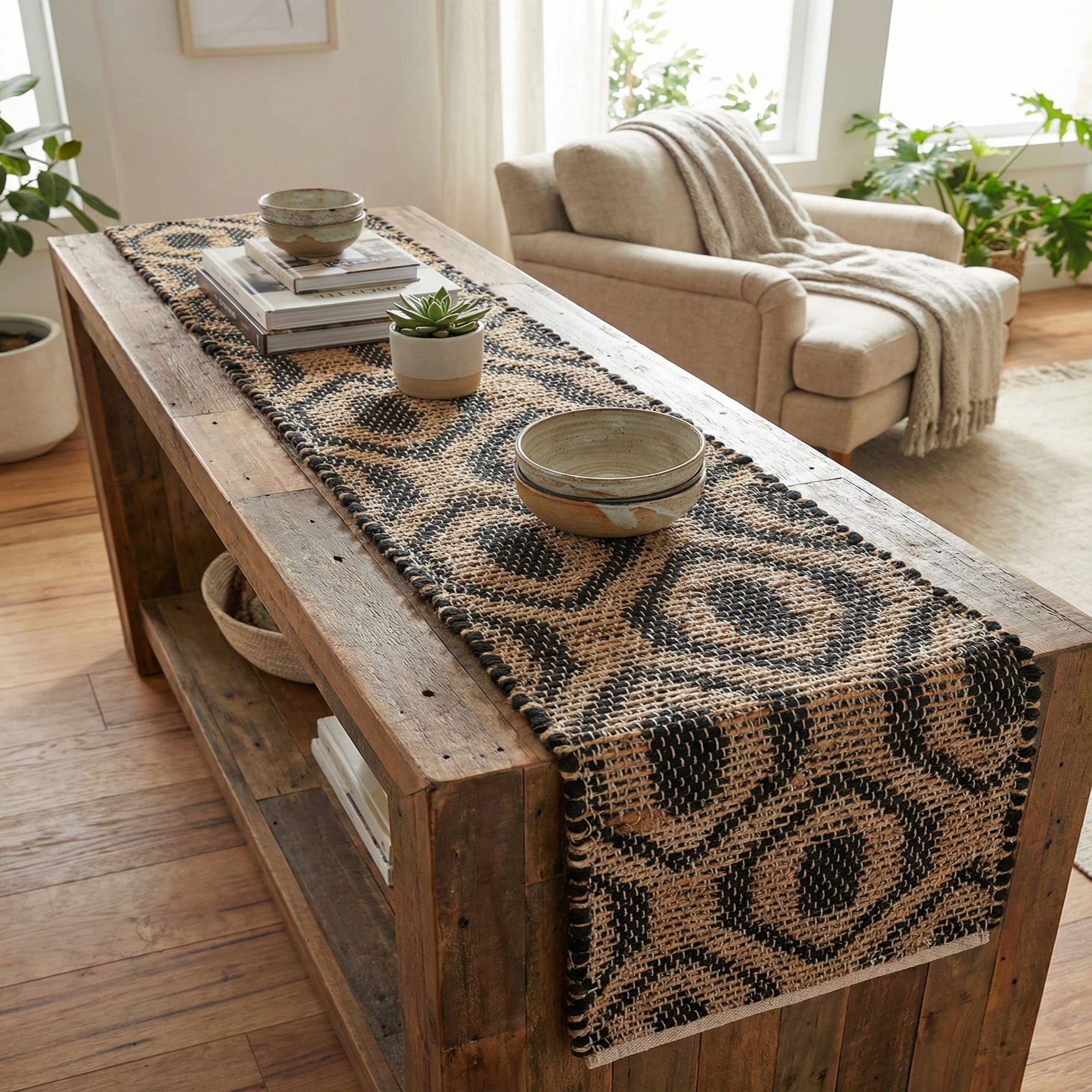 This runner suits a range of interiors: place it along a reclaimed wood dining table to highlight rustic or farmhouse accents, lay it on a dark console or sideboard for contrast in a modern industrial setting, or use it as a base for layered tabletop styling in a bohemian dining vignette. It also works well on a kitchen island or buffet where woven texture and bold graphic pattern can anchor décor and add visual interest without overpowering surrounding elements.