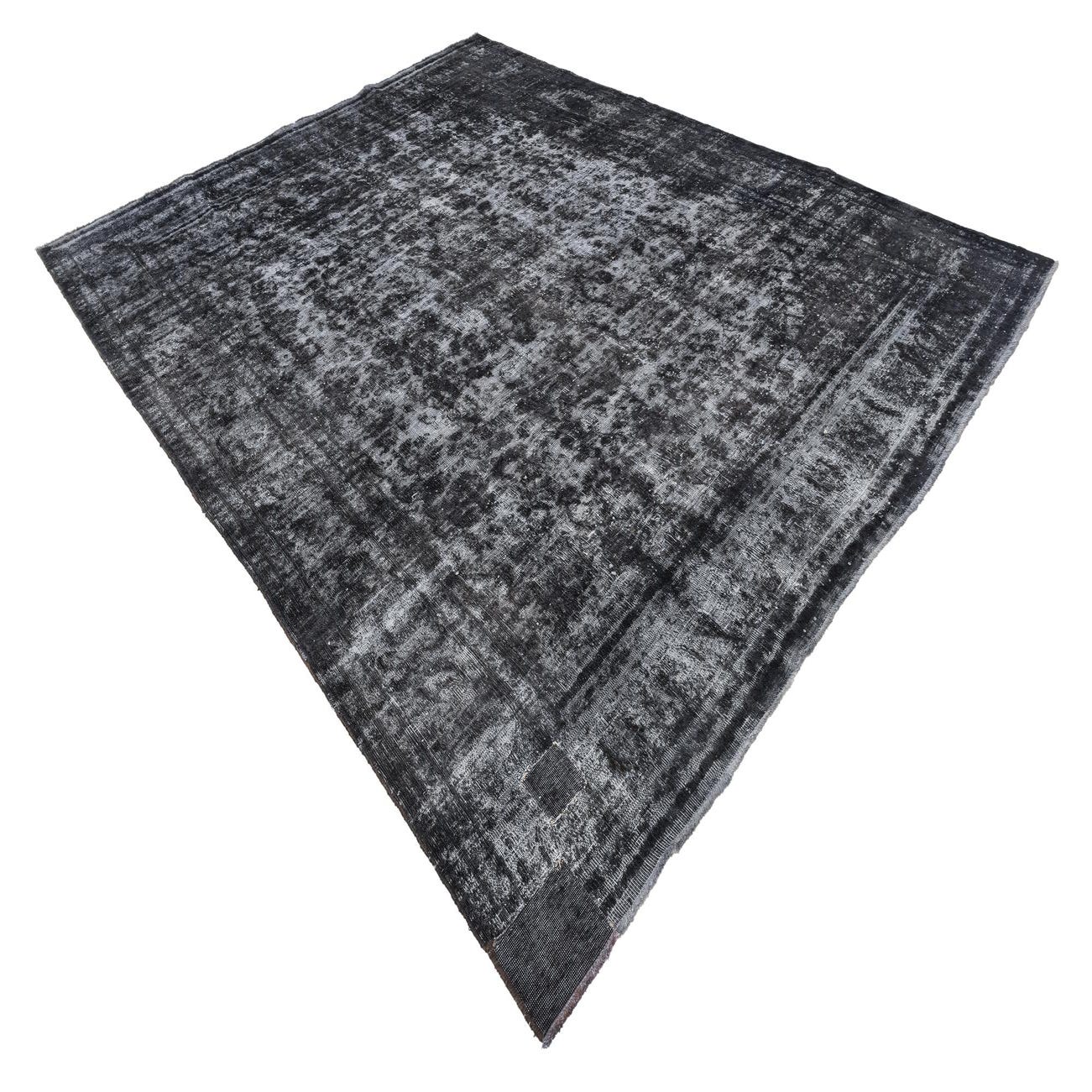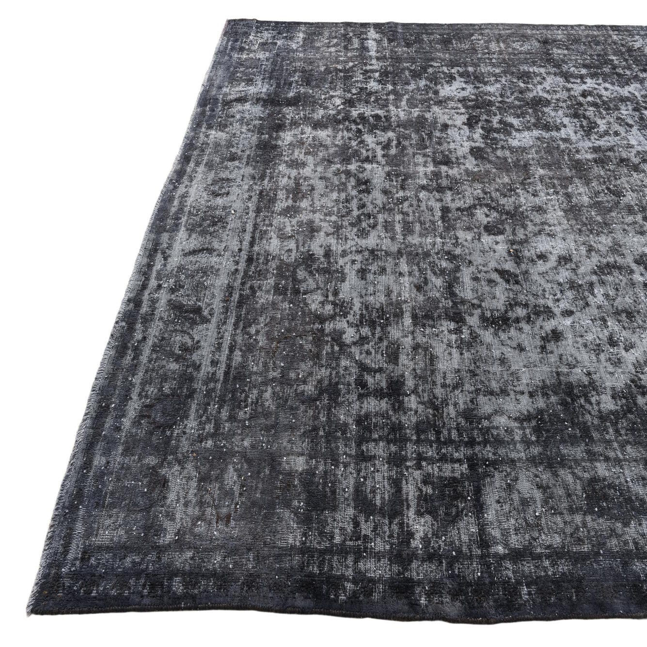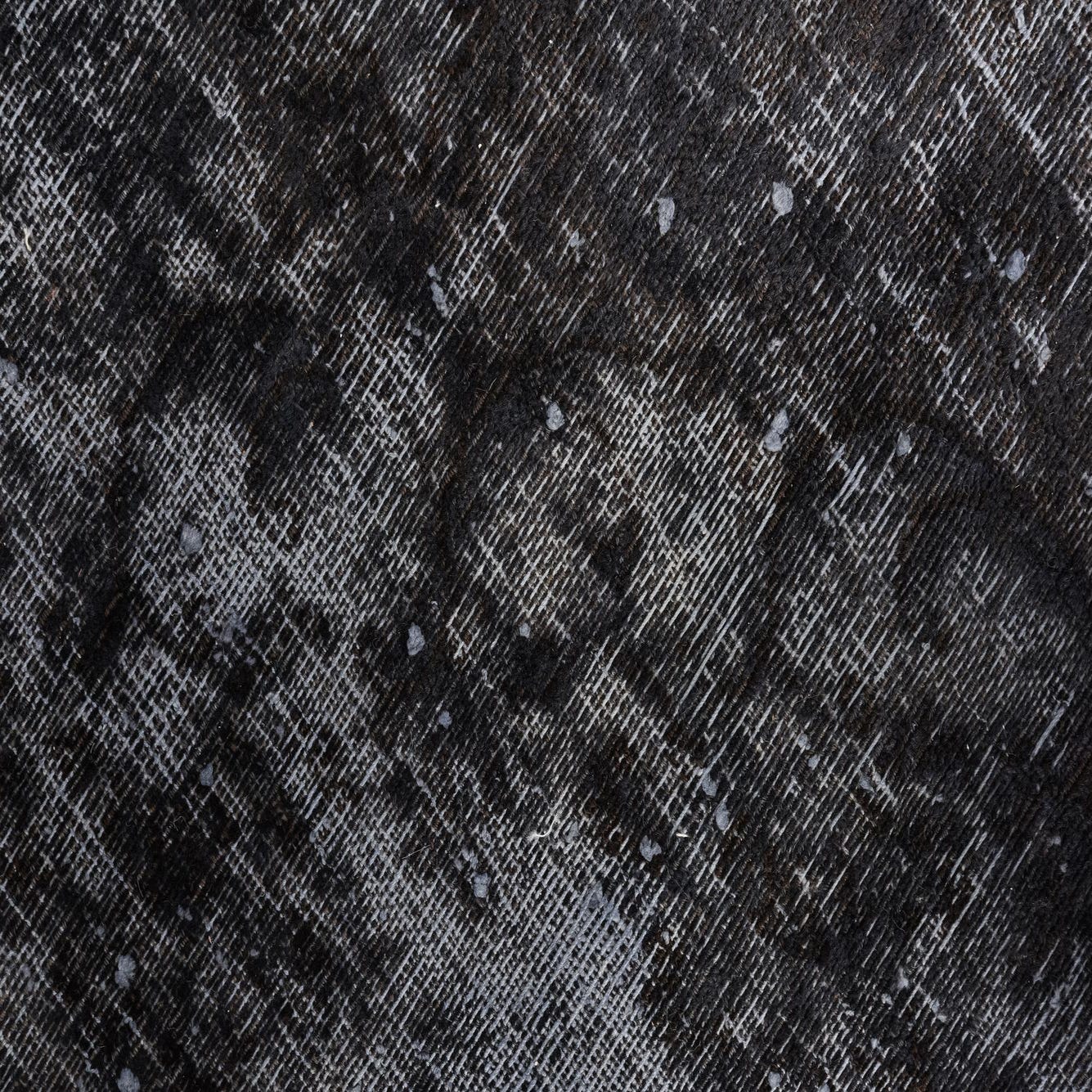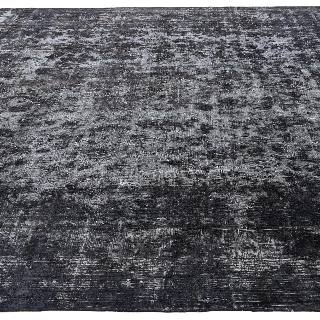 The striking pattern, characterized by an abstract, distressed style, renders the piece versatile, creating a focal point that can anchor a room. Its black background is complemented with gray variations, adding depth and texture. This rug is defined by a sense of aged elegance without compromising on contemporary aesthetics.