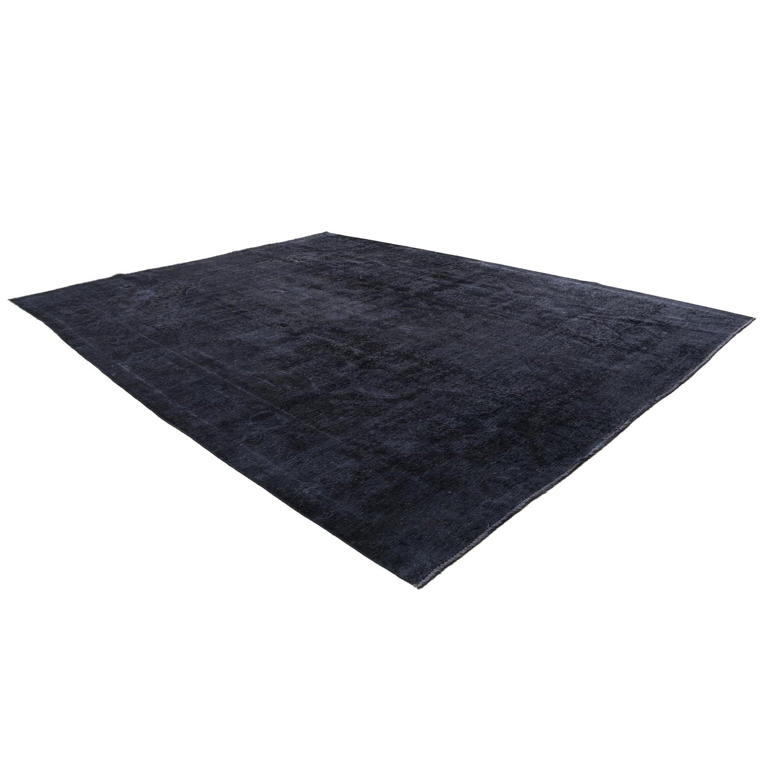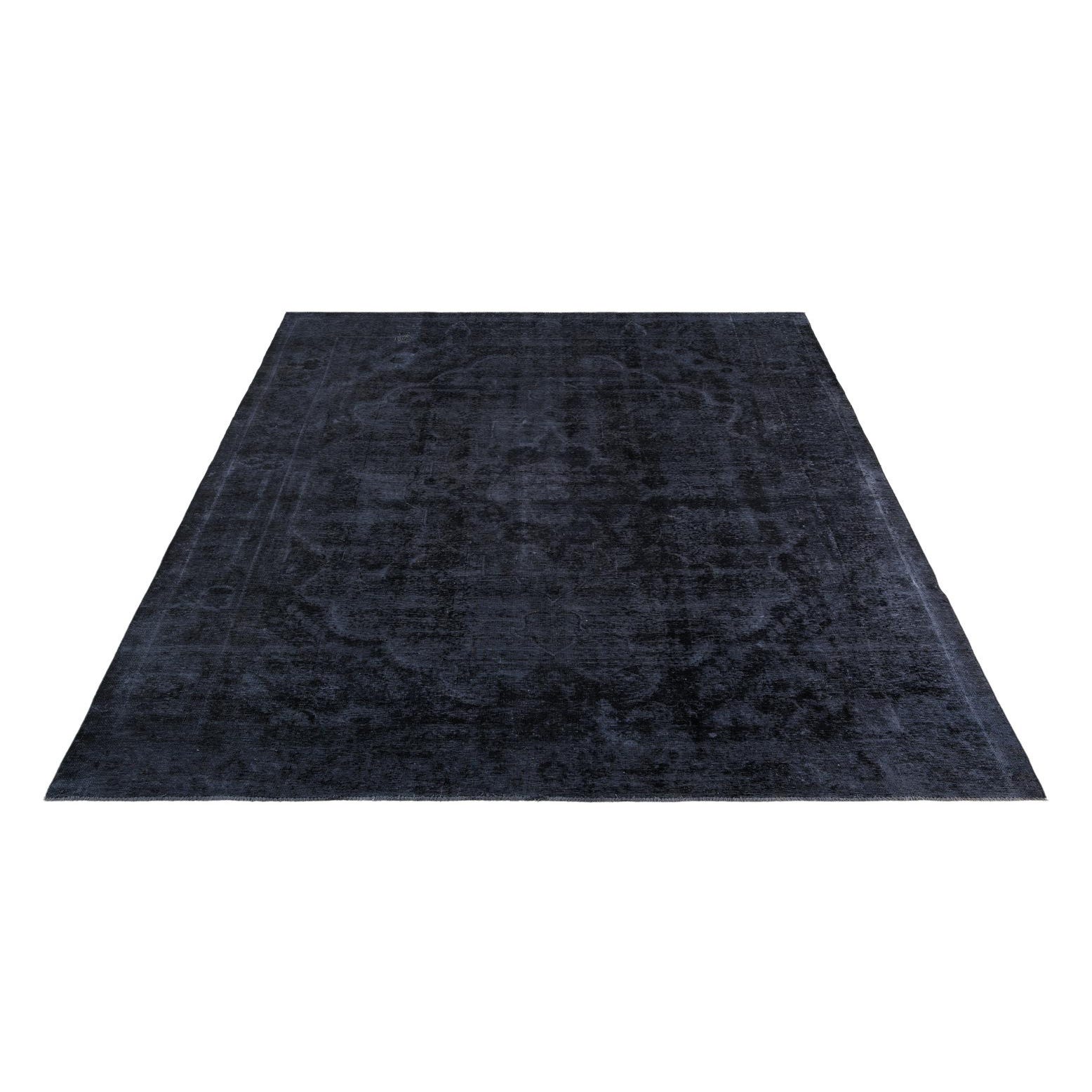 A 10x12 rectangular black wool rug with a subtle, faded Persian medallion pattern, suitable for indoor spaces.