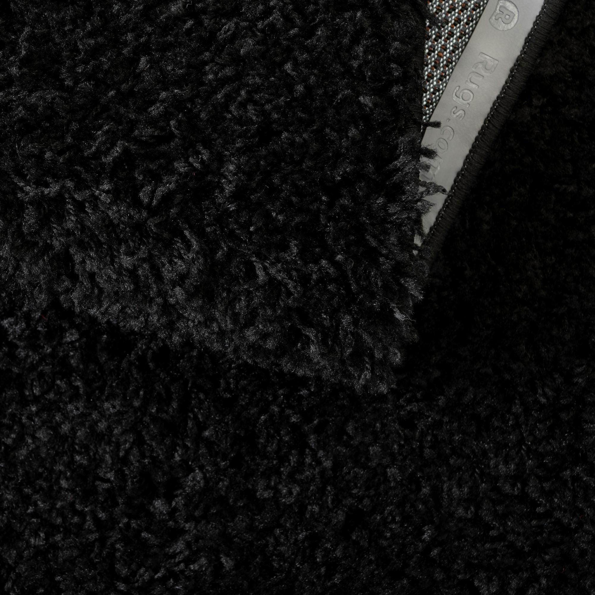 A solid black, high-pile shag with a clean, unbroken field that reads modern and minimal. The dense polypropylene fibers feel plush and velvety to the touch, offering a soft, cushioned surface that gently yields underfoot while keeping a uniform look across the face. Machine-made construction produces consistent pile height and neat edges for a tidy, low-fuss appearance.