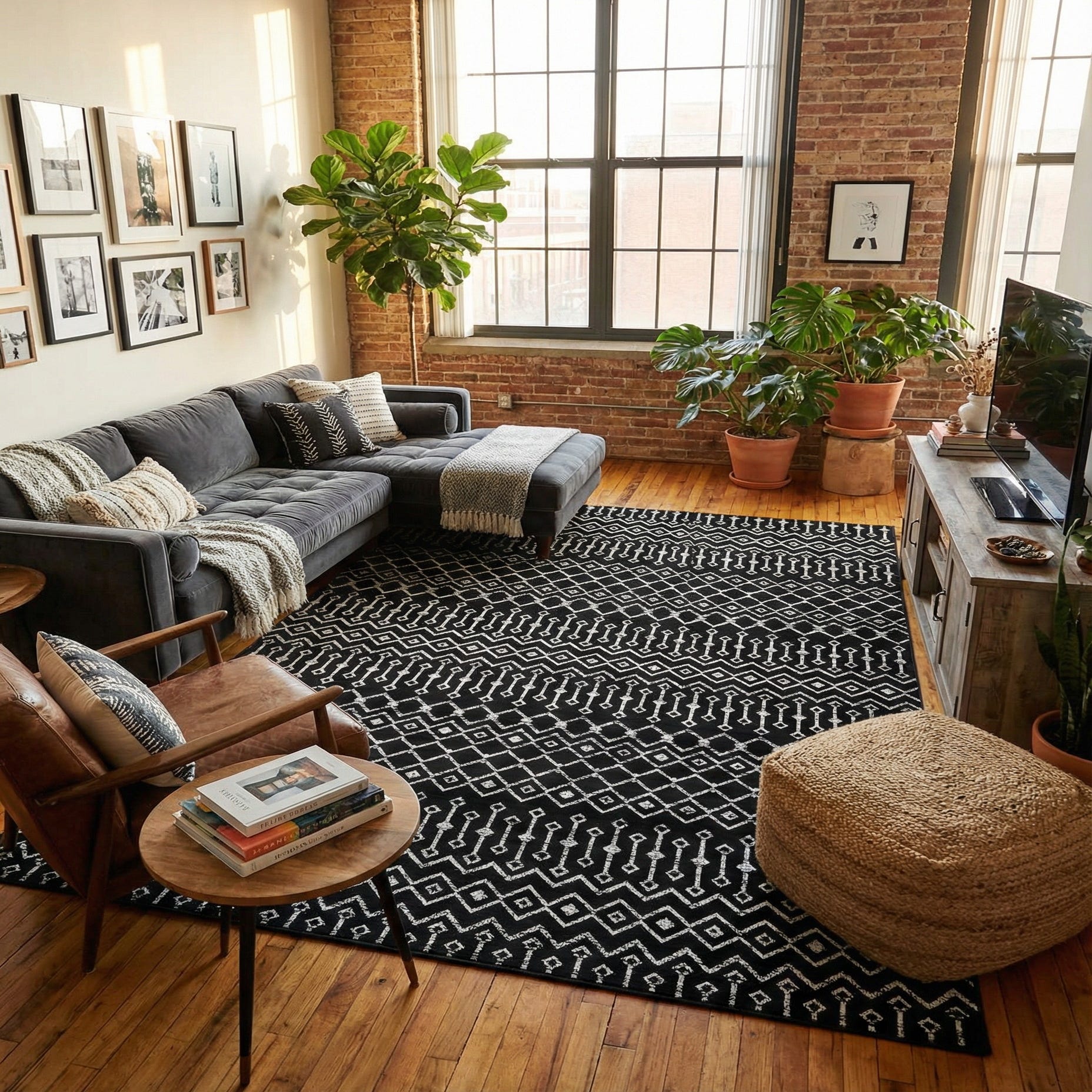 This high-contrast palette works well to anchor a contemporary living room beneath a sofa and coffee table, add graphic interest to a dining area with light wood furnishings, or define an entryway or home office. Pair it with neutral upholstery and warm metals for a modern look, layer it over a natural-fiber rug for a relaxed boho vibe, or use it to bring crisp contrast into an industrial or monochrome scheme.