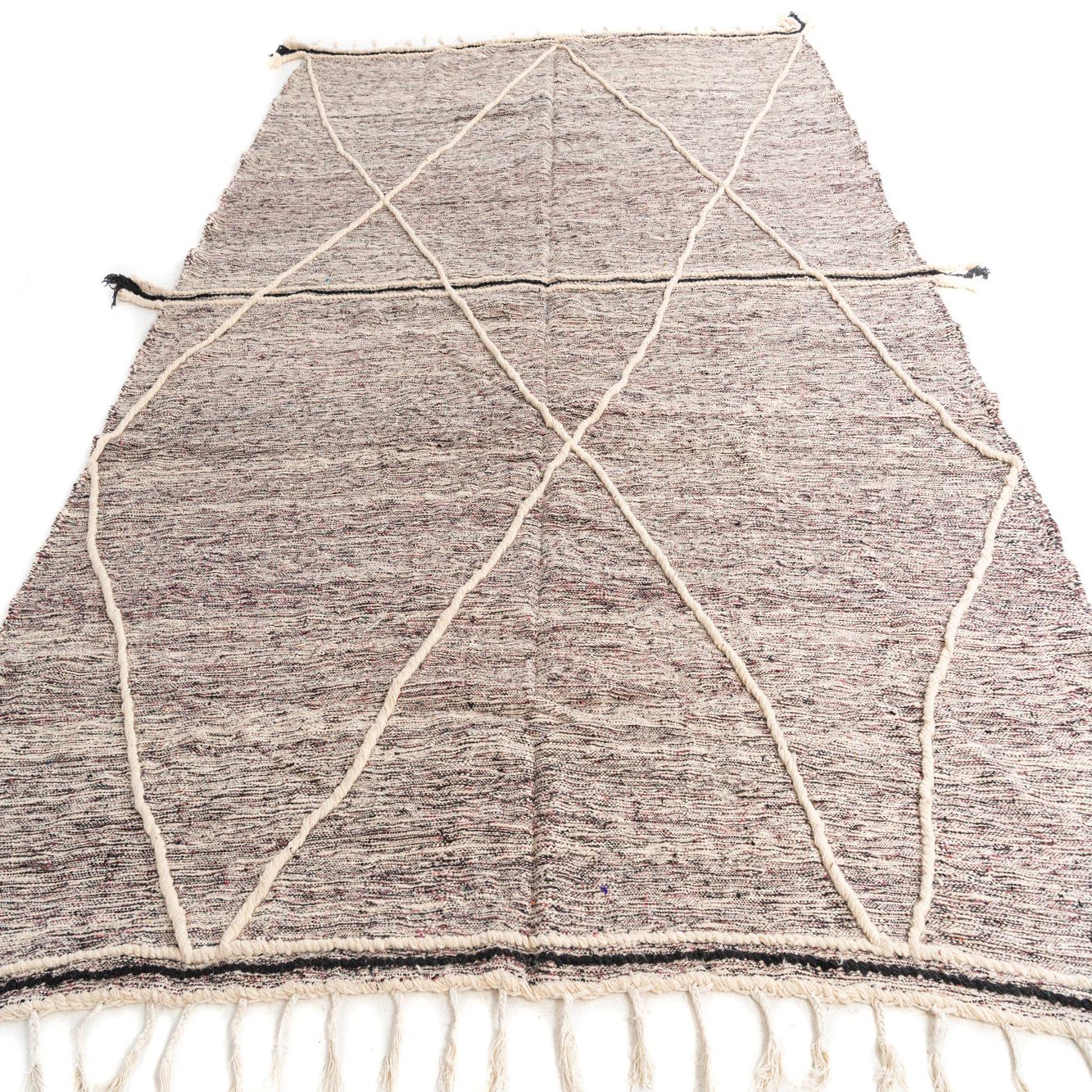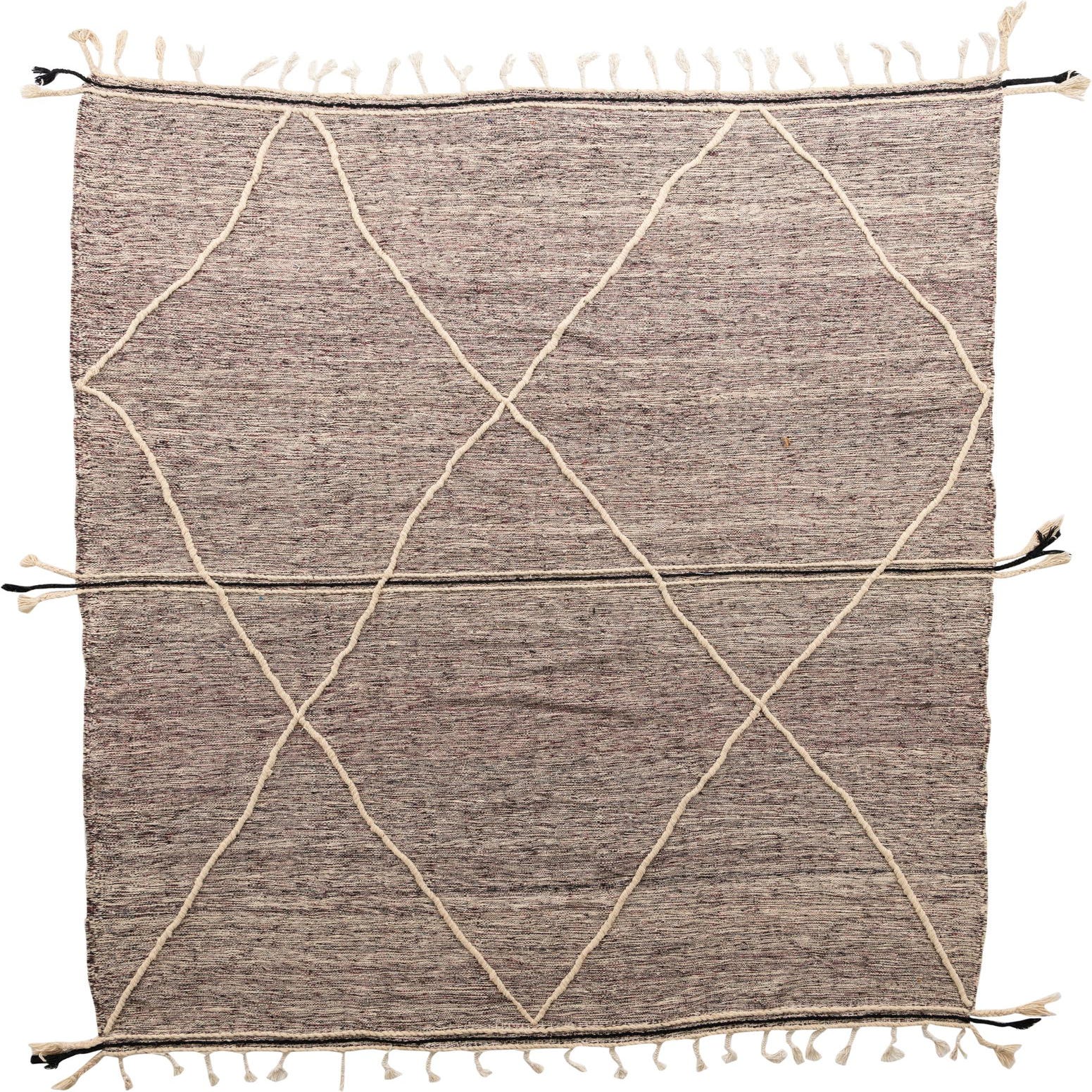 This Moroccan collection rug, sized at an ample 10x13 feet, presents a sophisticated and timeless aesthetic, hand-knotted from 100% wool for lasting quality and comfort underfoot. Boasting a bold black background, the design is accented with nuanced hues of violet and ivory, creating a striking contrast. The rug's pattern features simplistic geometric lines that contribute to its authentic Moroccan flair.