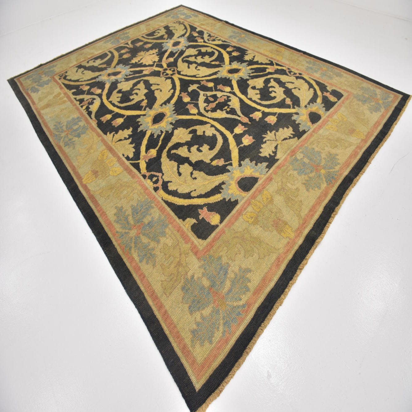 A 10x13 rectangular Oushak rug featuring a black field with intricate gold and light blue traditional floral patterns, framed by a light beige border with complementary motifs.