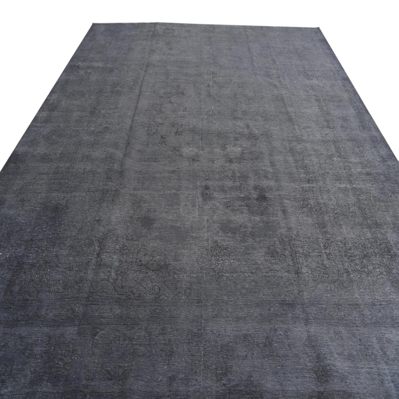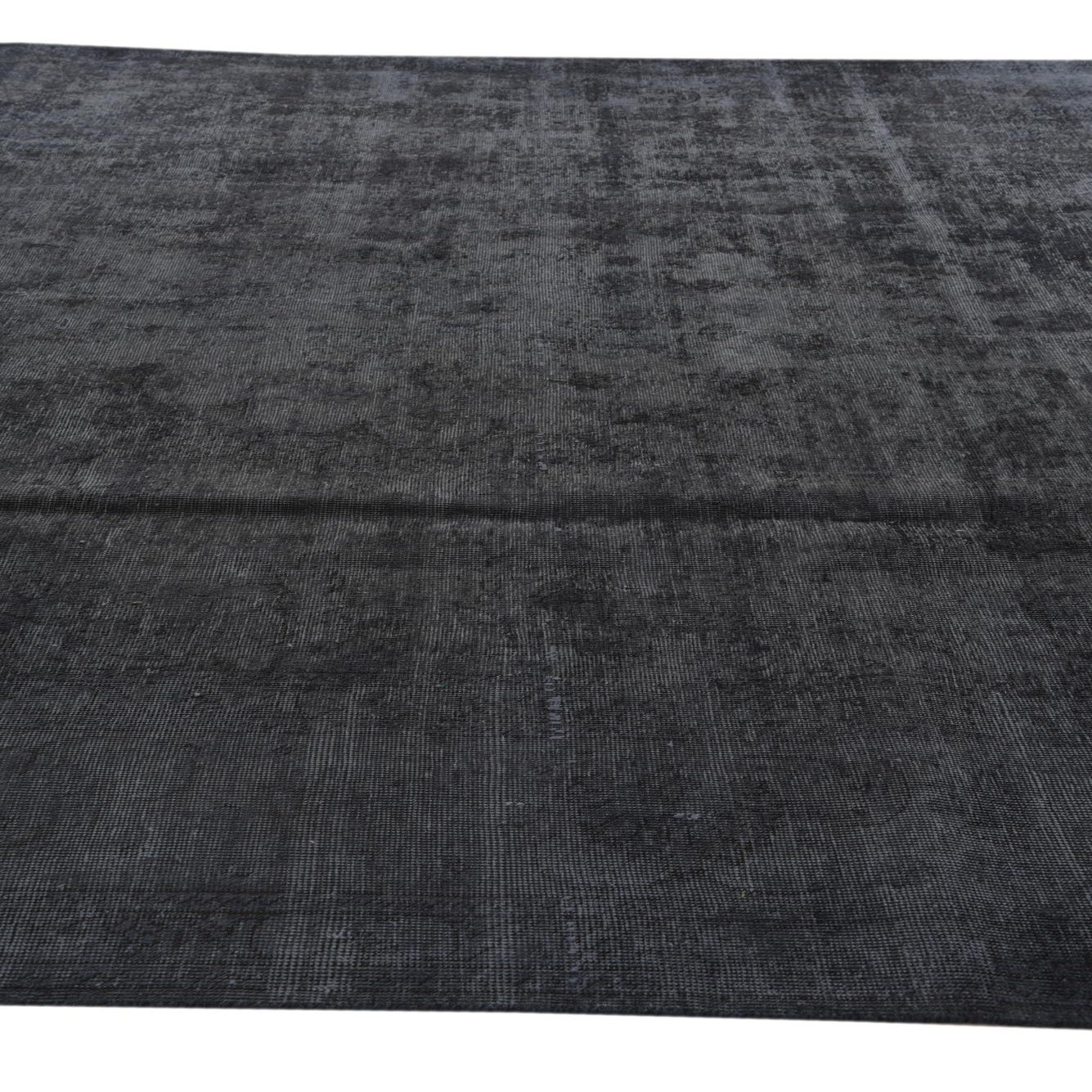 A large 10x13 rectangular black wool rug with a subtle, distressed Persian medallion pattern, suitable for a living room.