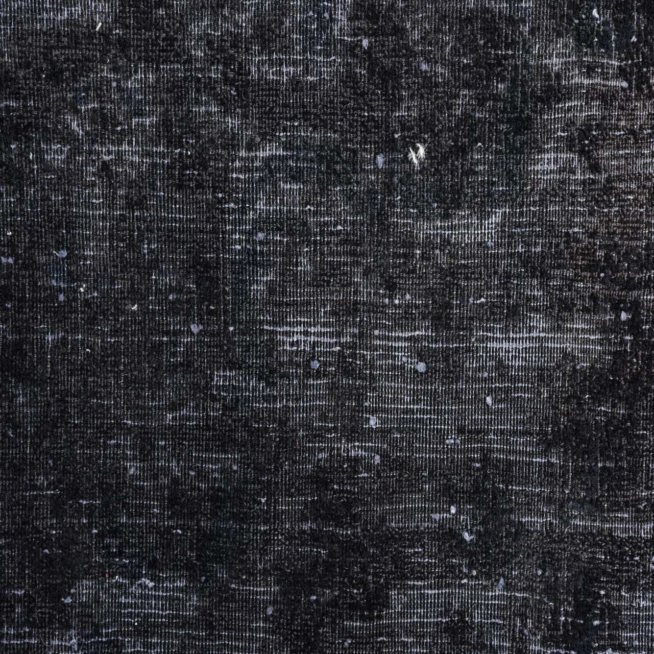 A 10x13 rectangular black wool rug with a distressed vintage Persian pattern, suitable for a living room.