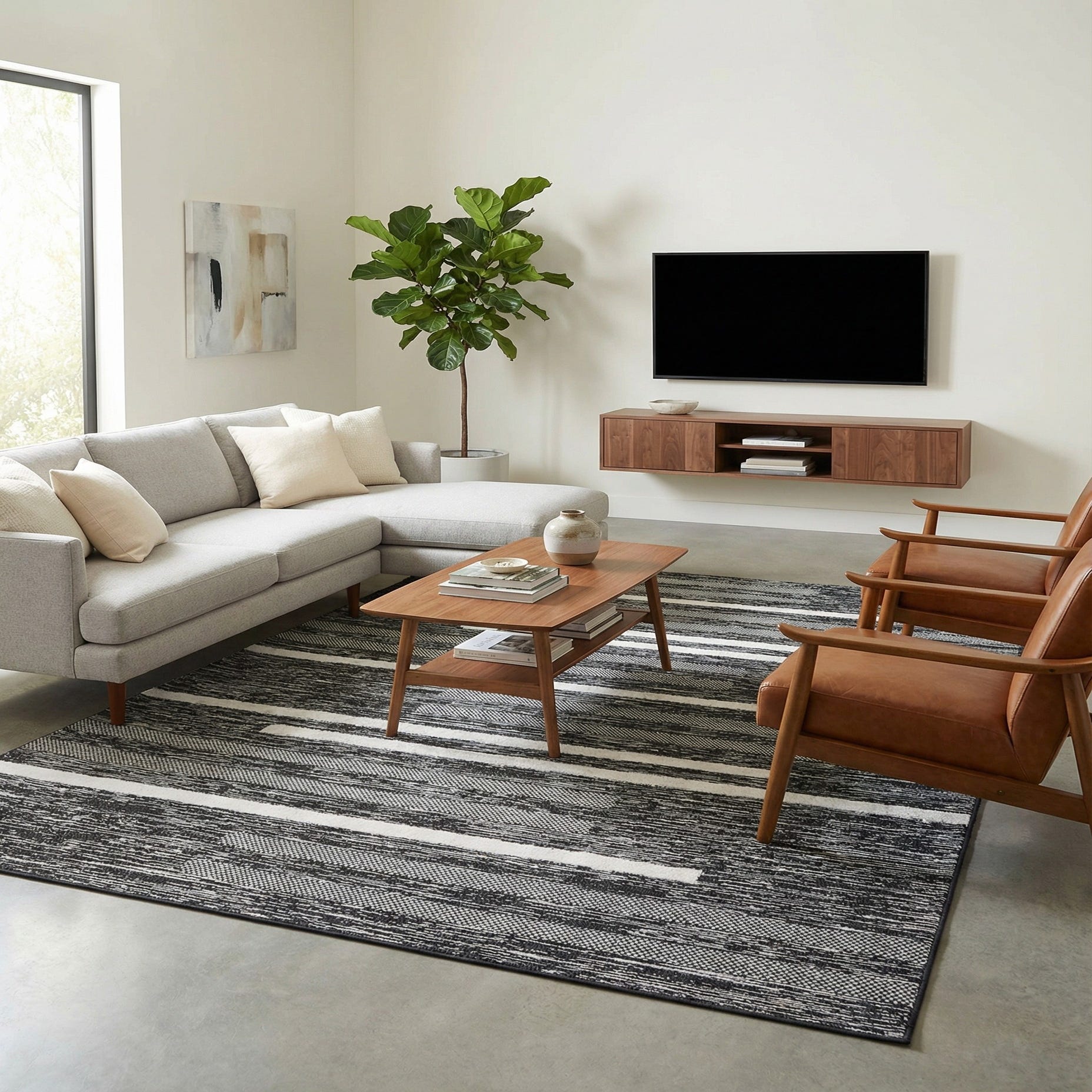 A 10x14 rectangular Abbey rug by Rugs.com, featuring a modern stripe pattern in black and white with varied textures.