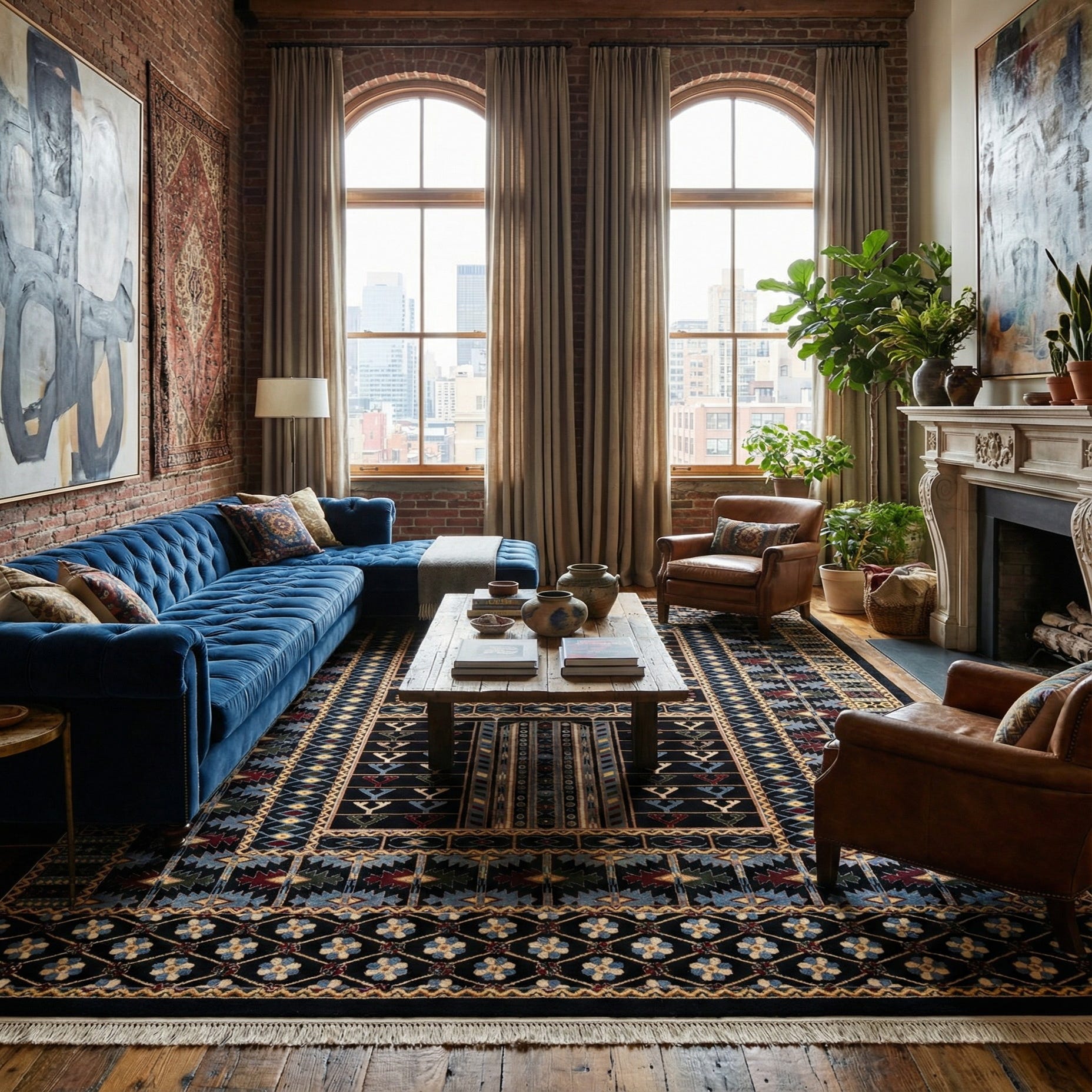 This pattern and palette anchor larger furniture arrangements, making the rug a natural choice for a formal living room, under a dining table, or in a study or library. Pair it with warm wood tones, leather seating or neutral sofas and add accents in beige and blue to echo the rug’s colors; matte black or brass fixtures will complement the strong black background and bring the room together.