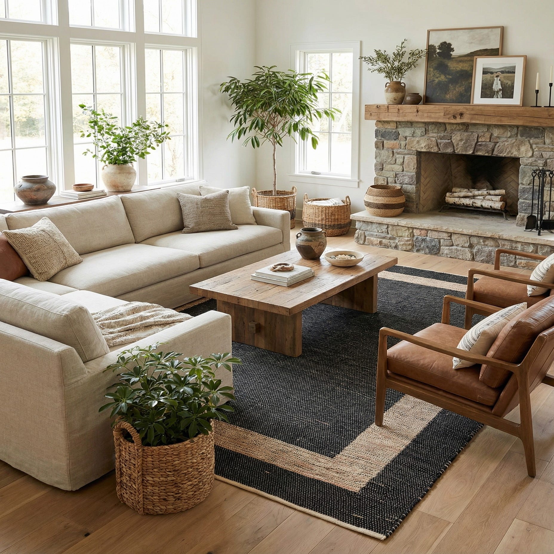 This palette and pattern work well in a range of interiors: let it anchor a seating area in a contemporary living room, sit beneath a dining table to add contrast with light wood furniture, or define a home office with clean lines. It pairs naturally with neutral textiles, metal or blackened steel accents, and warm wood tones, and complements minimalist, Scandinavian, modern farmhouse, or industrial schemes that benefit from a simple, graphic floor layer.