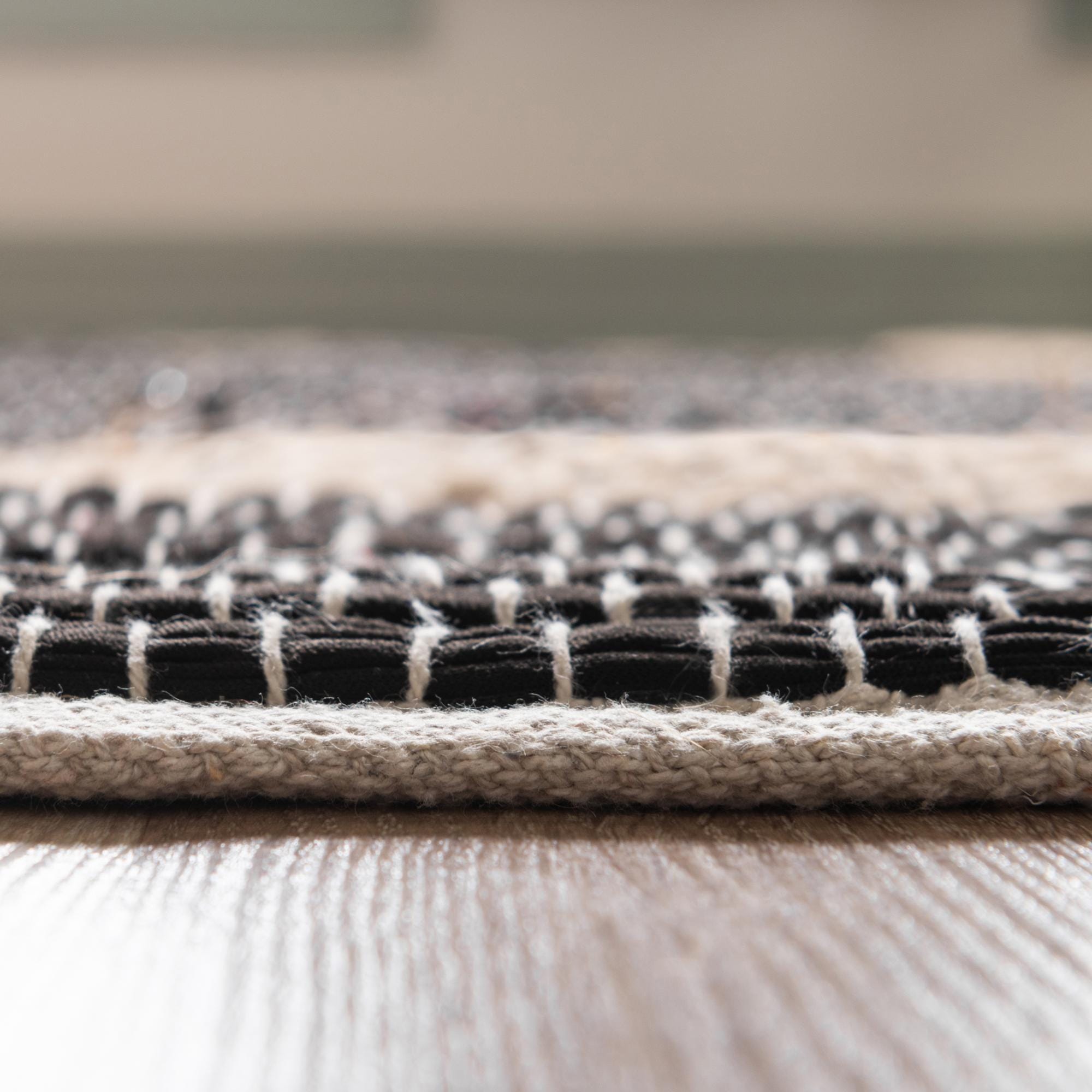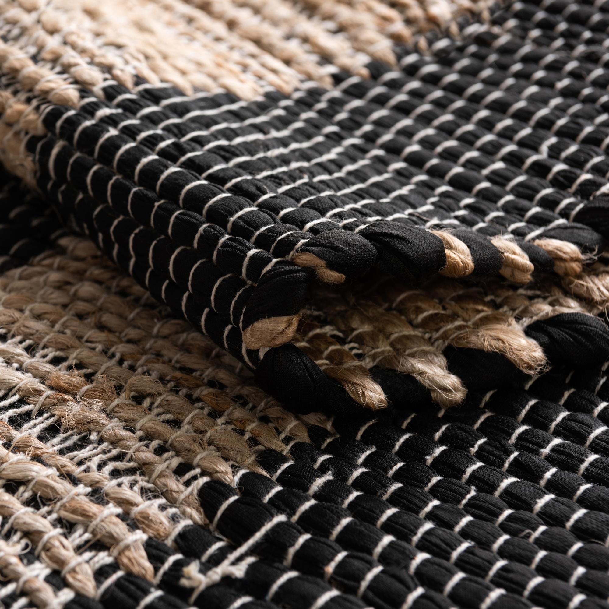 A bold black field is set off by a wide natural jute border that forms a simple, modern frame. Hand?woven from 60% cotton and 40% jute, the flatweave construction shows subtle irregularities and tiny slubs that give the surface visual depth and a tactile, woven feel. The low?profile texture is slightly coarse where the jute runs, softened by the cotton weft, so the rug lies flat and grounded underfoot while still offering a sense of natural fiber warmth.